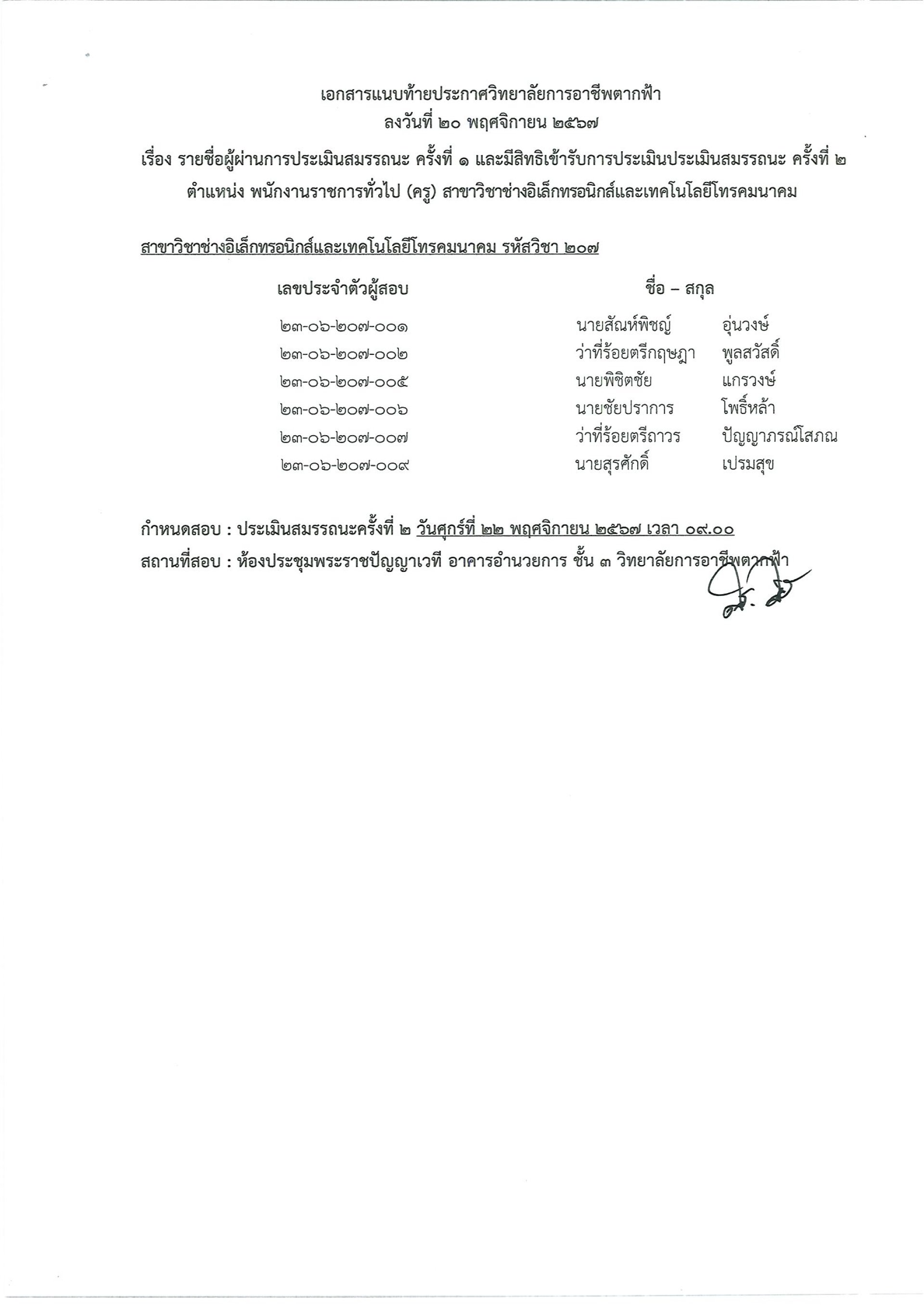 ประกาศวิทยาลัยการอาชีพตากฟ้า เรื่อง รายชื่อผู้ผ่านการประเมินสมรรถนะครั้งที่ 1 และมีสิทธิ์เข้ารับการประเมินสมรรถนะครั้งที่ 2 ตำแหน่งพนักงานราชการทั้วไป (ครู) สาขาวิชาช่างอิเล็กทรอนิกส์และเทคโนโลยีโทรคมนาคม รหัสวิชา 207