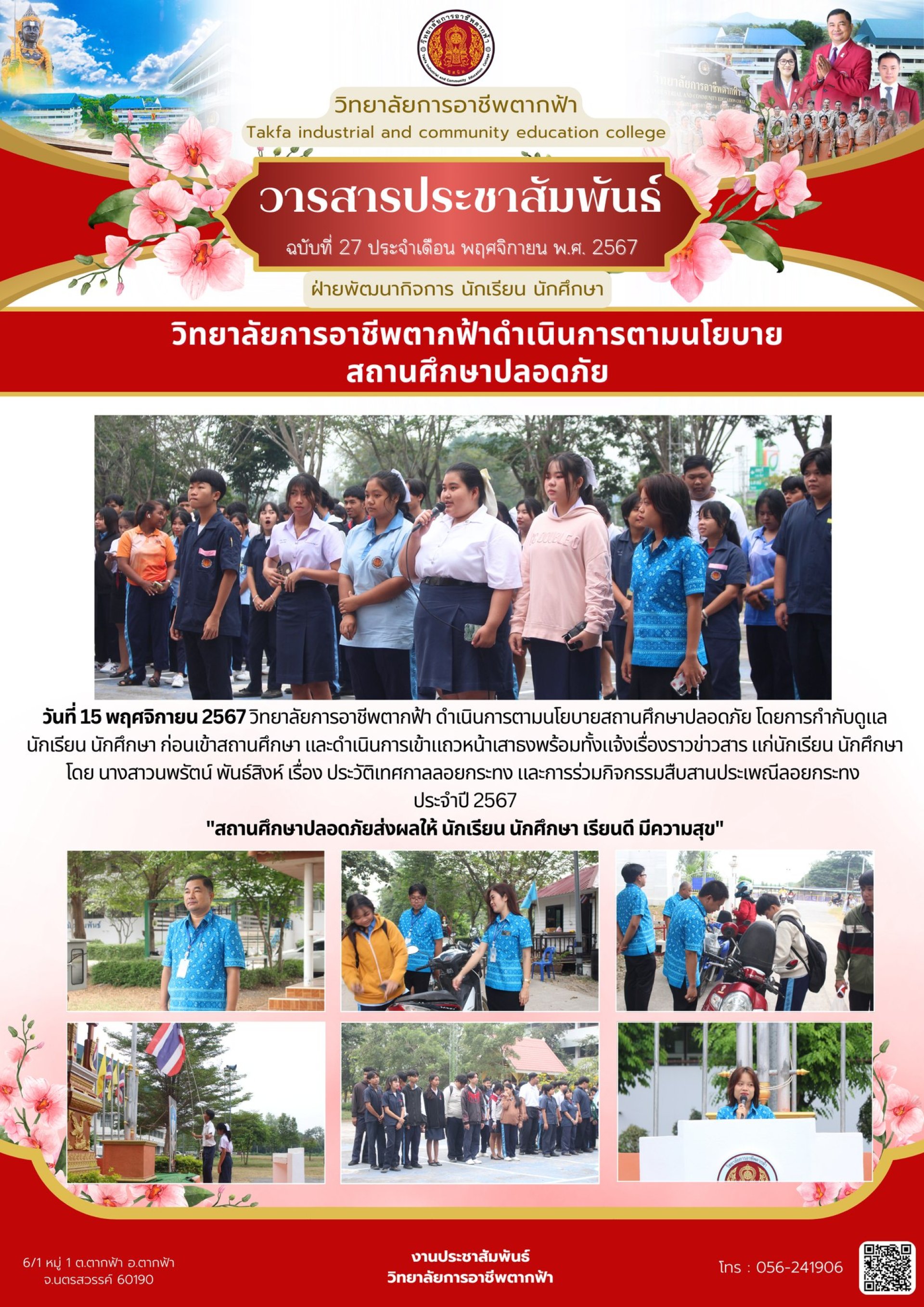 วารสารตากฟ้า ประจำเดือน พฤศจิกายน 2567 ฉบับที่ 27 วิทยาลัยการอาชีพตากฟ้าดำเนินการตามนโยบายสถานศึกษาปลอดภัย