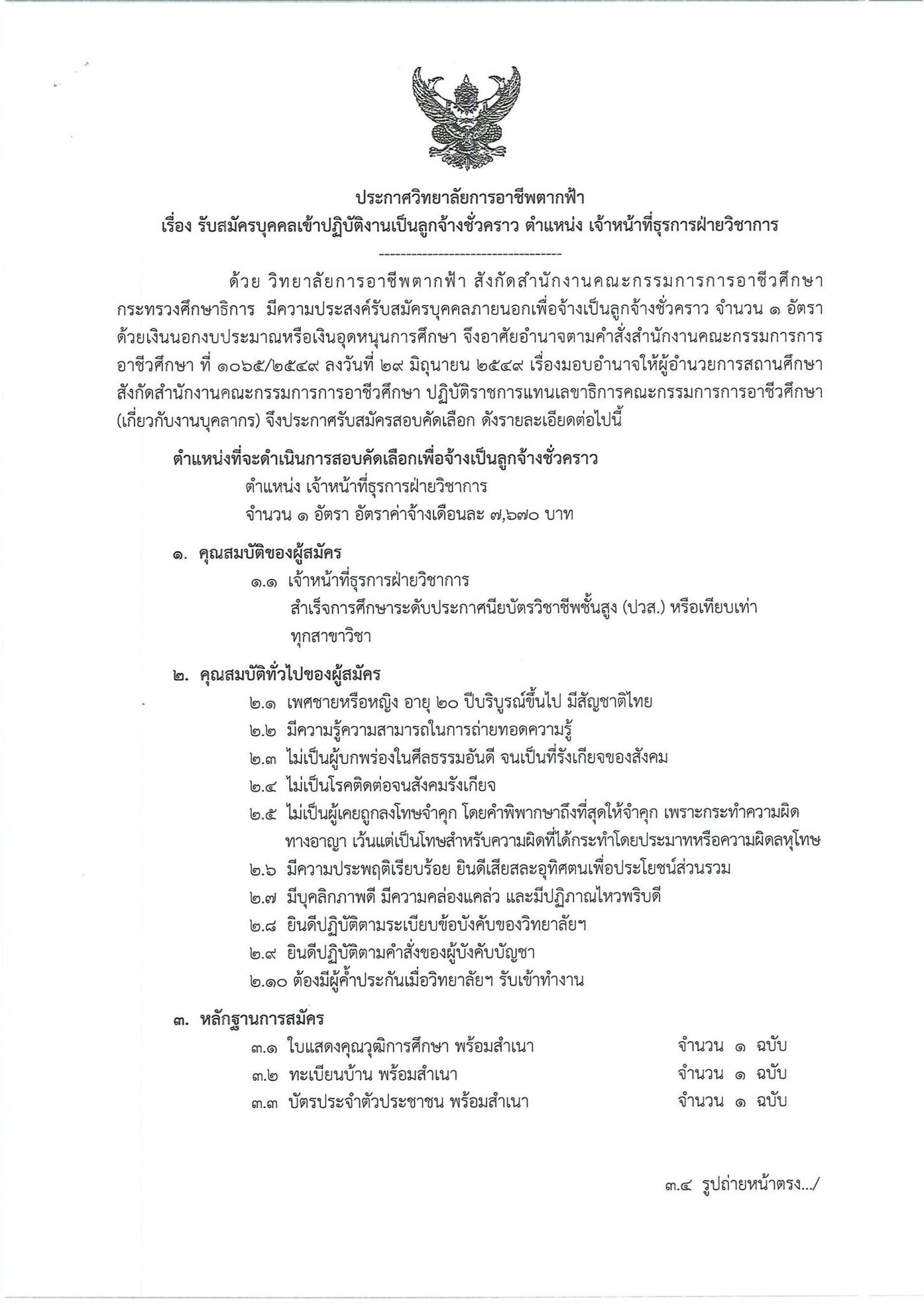 ประกาศวิทยาลัยการอาชีพตากฟ้า เรื่อง รับสมัครบุคคลเข้าปฏิบัติงานเป็นลูกจ้างชั่วคราว วิทยาลัยการอาชีพตากฟ้า มีความประสงค์รับสมัครบุคคลภายนอกเพื่อจ้างเป็นลูกจ้างชั่วคราว จำนวน ๑ อัตรา ๑. ตำแหน่ง เจ้าหน้าที่ธุรการฝ่ายวิชาการ จำนวน ๑ อัตรา