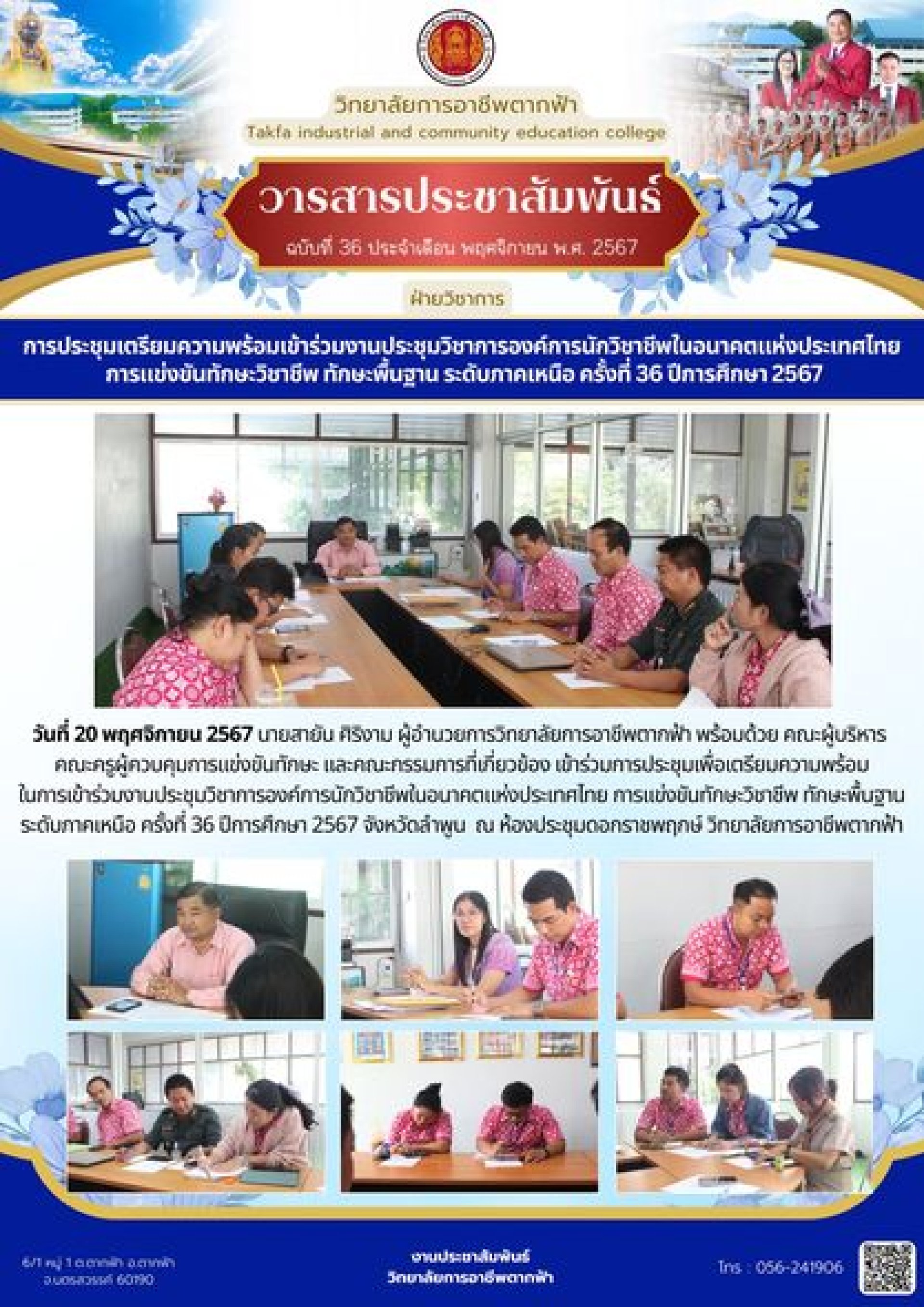 วารสารตากฟ้า ประจำเดือน พฤศจิกายน 2567 ฉบับที่ 36 การประชุมเตรียมความพร้อมเข้าร่วมงานประชุมวิชาการองค์การนักวิชาชีพในอนาคตแห่งประเทศไทย การแข่งขันทักษะวิชาชีพ ทักษะพื้นฐาน ระดับภาคเหนือ ครั้งที่ 36 ปีการศึกษา 2567