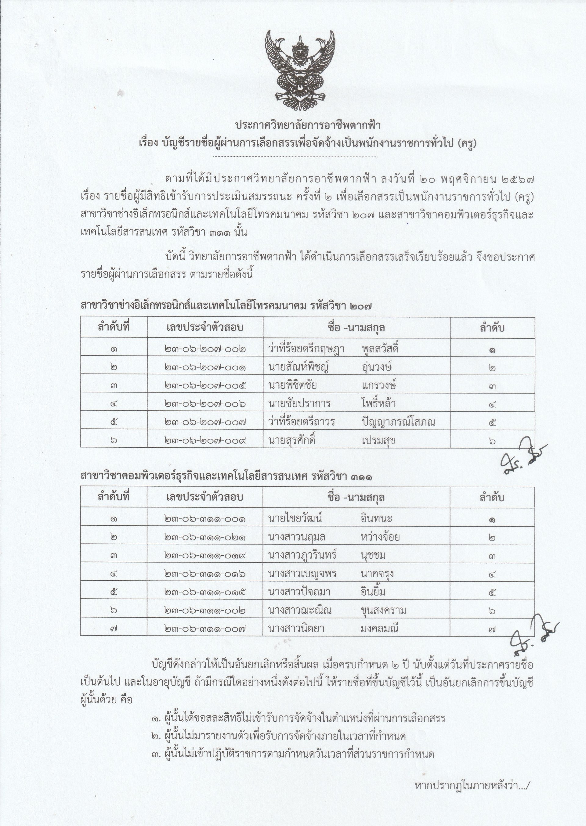 ประกาศวิทยาลัยการอาชีพตากฟ้า เรื่อง บัญชีรายชื่อผู้ผ่านการคัดเลือกสรรเพื่อจัดจ้างเป็นพนักงานราชการ (ครู) ให้มารายงานตัว ในวันจันทร์ที่ 2 ธันวาคม 2567 เวลา 08.00 น. ณ วิทยาลัยการอาชีพตากฟ้า