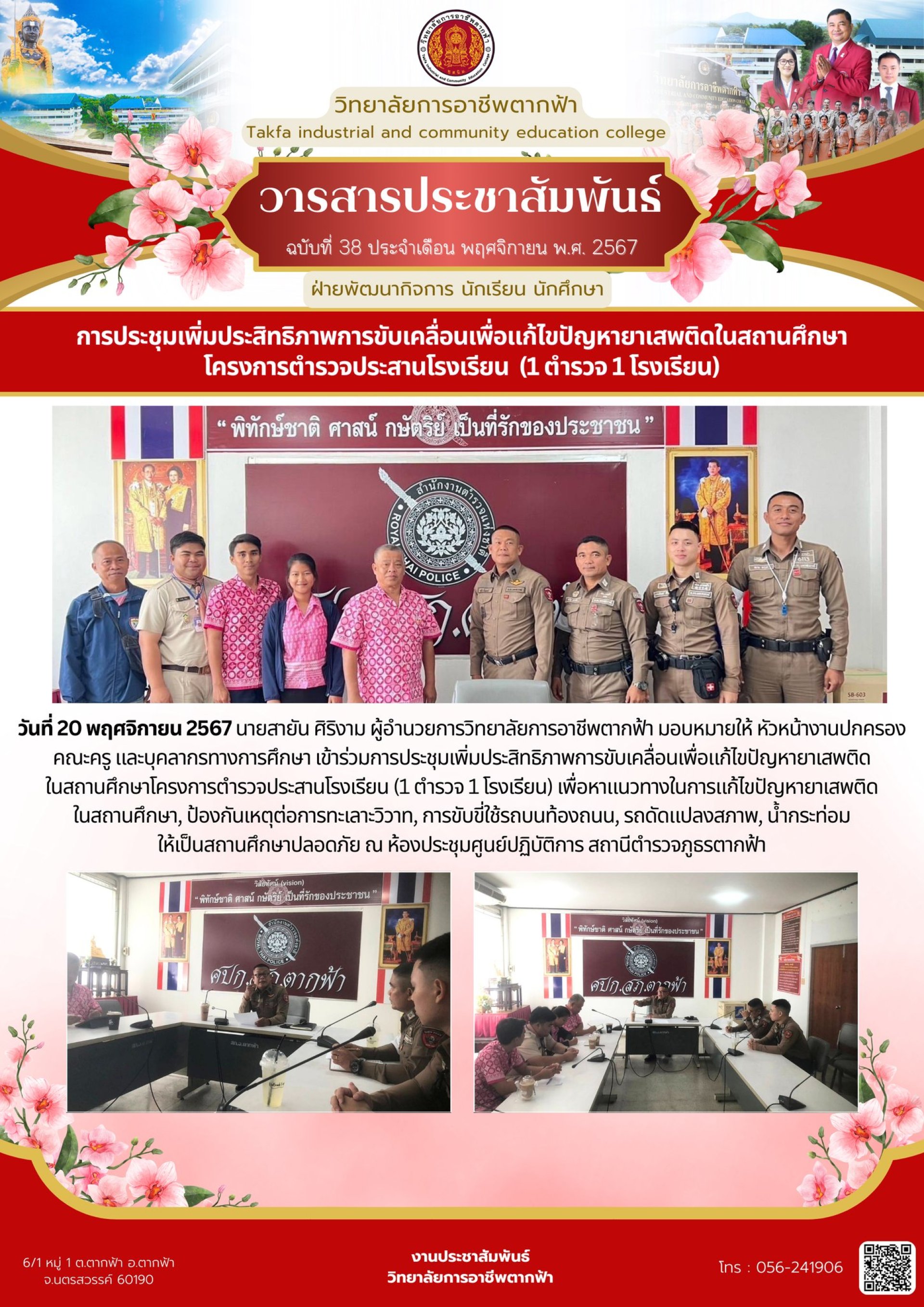 วารสารตากฟ้า ประจำเดือน พฤศจิกายน 2567 ฉบับที่ 38 การประชุมเพิ่มประสิทธิภาพการขับเคลื่อนเพื่อแก้ไขปัญหายาเสพติดในสถานศึกษาโครงการตำรวจประสานโรงเรียน (1 ตำรวจ 1 โรงเรียน)