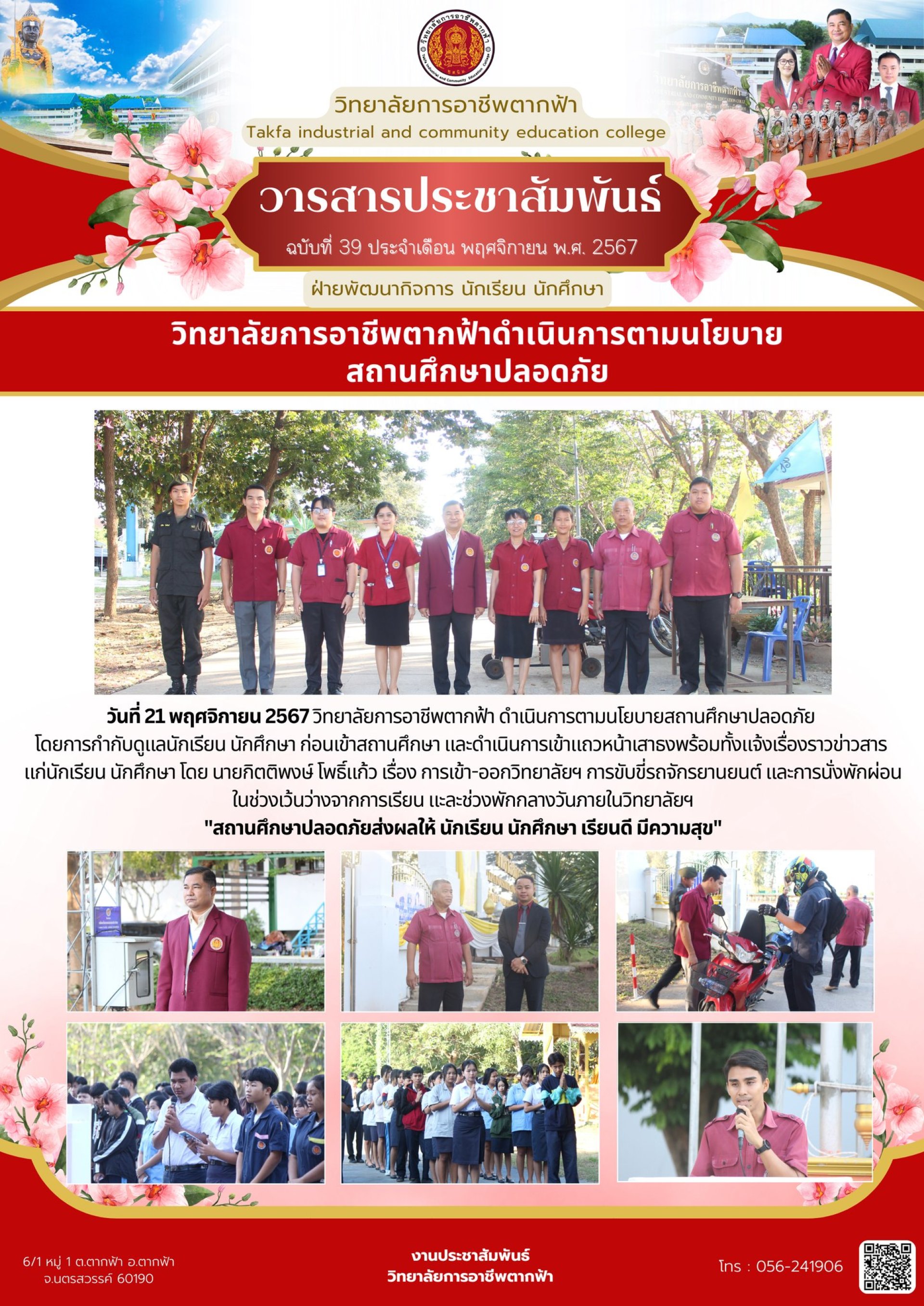 วารสารตากฟ้า ประจำเดือน พฤศจิกายน 2567 ฉบับที่ 39 วิทยาลัยการอาชีพตากฟ้าดำเนินการตามนโยบายสถานศึกษาปลอดภัย