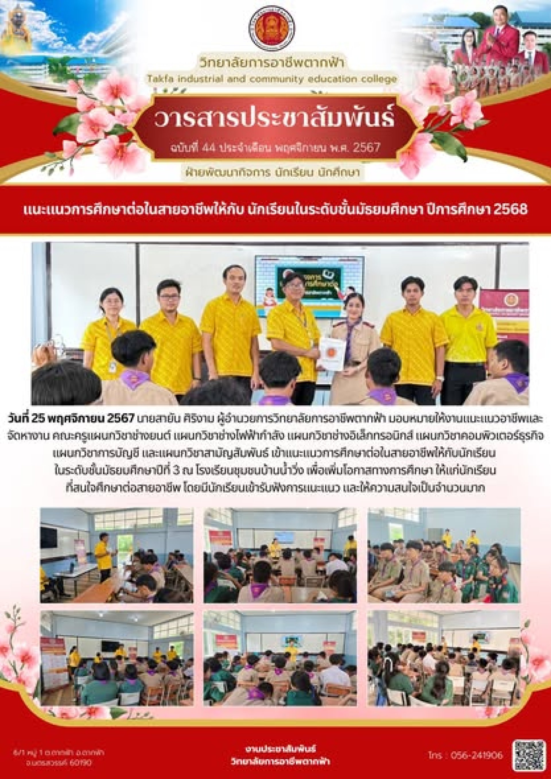 วารสารตากฟ้า ประจำเดือน พฤศจิกายน 2567 ฉบับที่ 44 แนะแนวการศึกษาต่อในสายอาชีพให้กับ นักเรียนในระดับชั้นมัธยมศึกษา ปีการศึกษา 2568