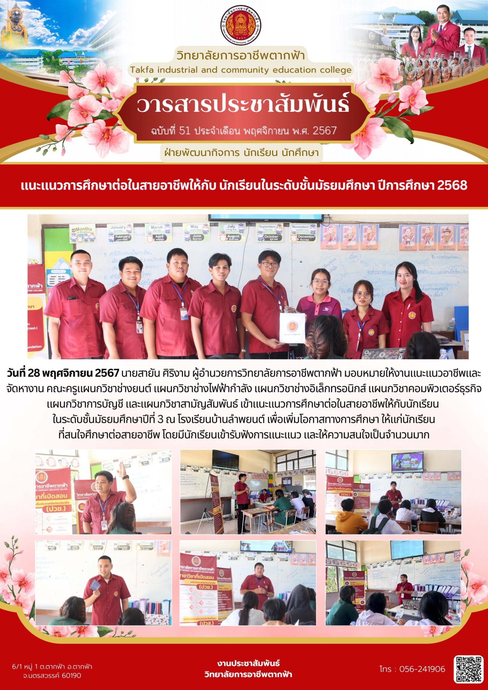 วารสารตากฟ้า ประจำเดือน พฤศจิกายน 2567 ฉบับที่ 51 แนะแนวการศึกษาต่อในสายอาชีพให้กับ นักเรียนในระดับชั้นมัธยมศึกษา ปีการศึกษา 2568