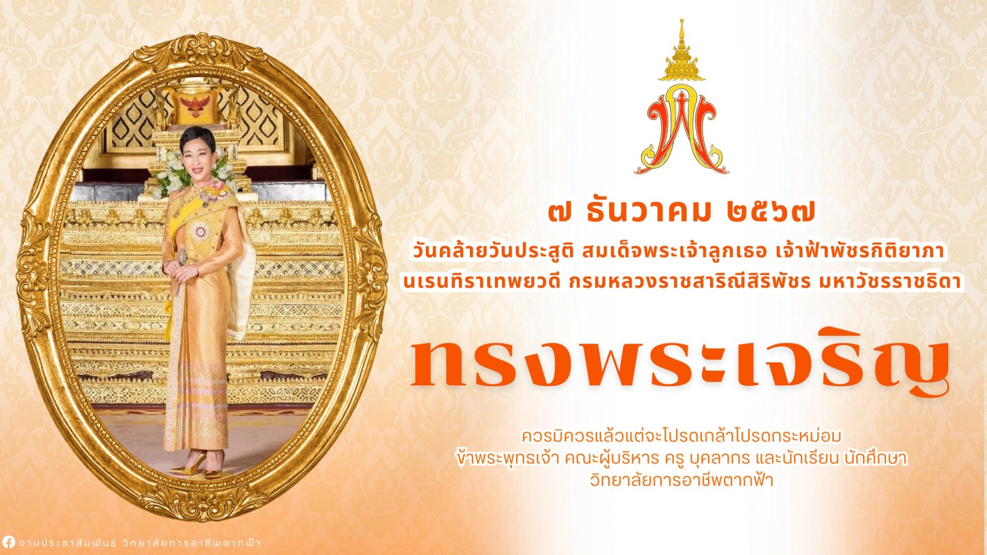 ๗ ธันวาคม ๒๕๖๗ เนื่องในโอกาสวันคล้ายวันประสูติสมเด็จพระเจ้าลูกเธอ เจ้าฟ้าพัชรกิติยาภา นเรนทิราเทพยวดี กรมหลวงราชสาริณีสิริพัชร มหาวัชรราชธิดา ควรมิควรแล้วแต่จะโปรดเกล้าโปรดกระหม่อม ข้าพระพุทธเจ้า คณะผู้บริหาร ครู บุคลากร และนักเรียน นักศึกษา วิทยาลัยการอา