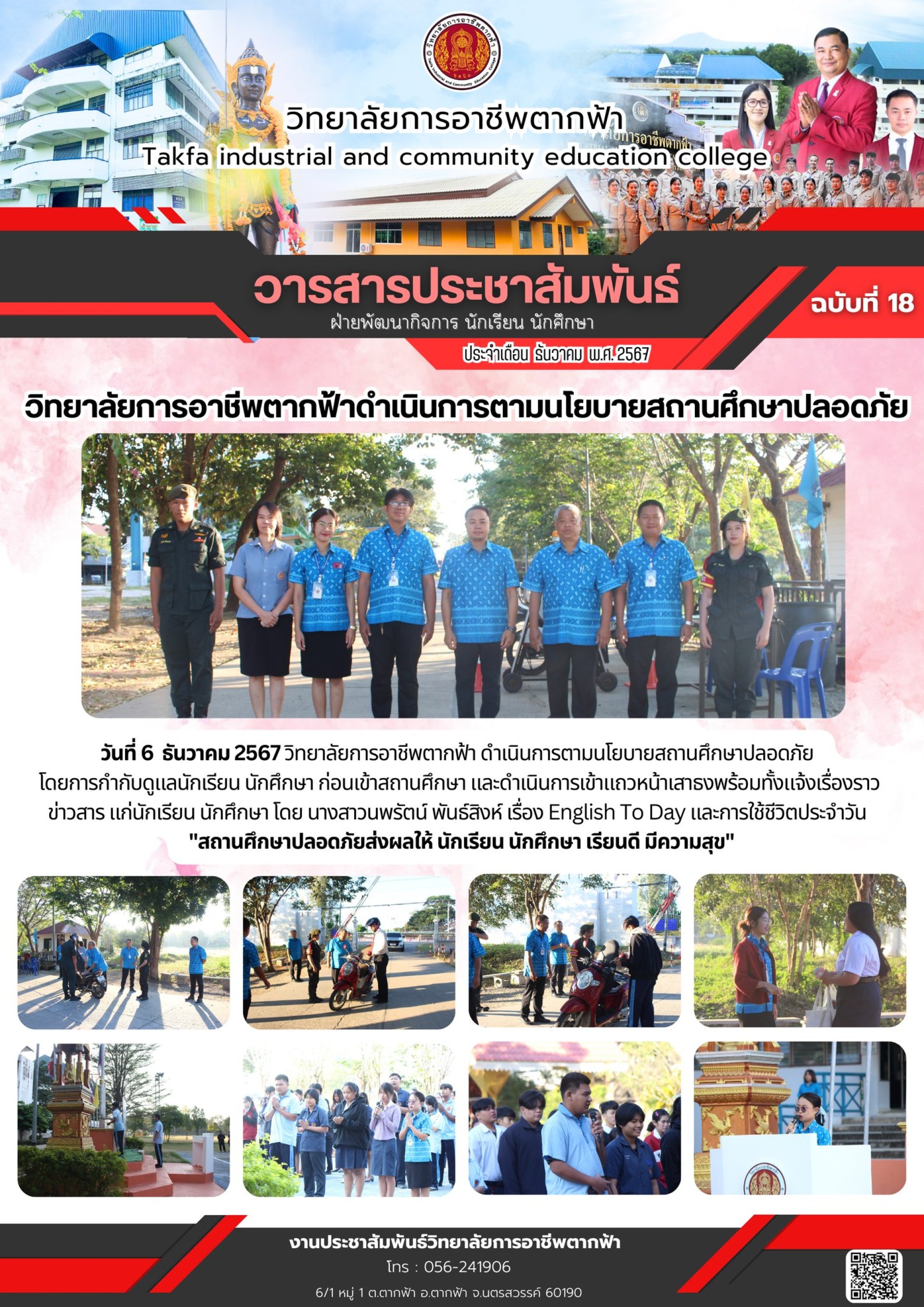 วารสารตากฟ้า ประจำเดือน ธันวาคม 2567 ฉบับที่ 18 วิทยาลัยการอาชีพตากฟ้าดำเนินการตามนโยบายสถานศึกษาปลอดภัย