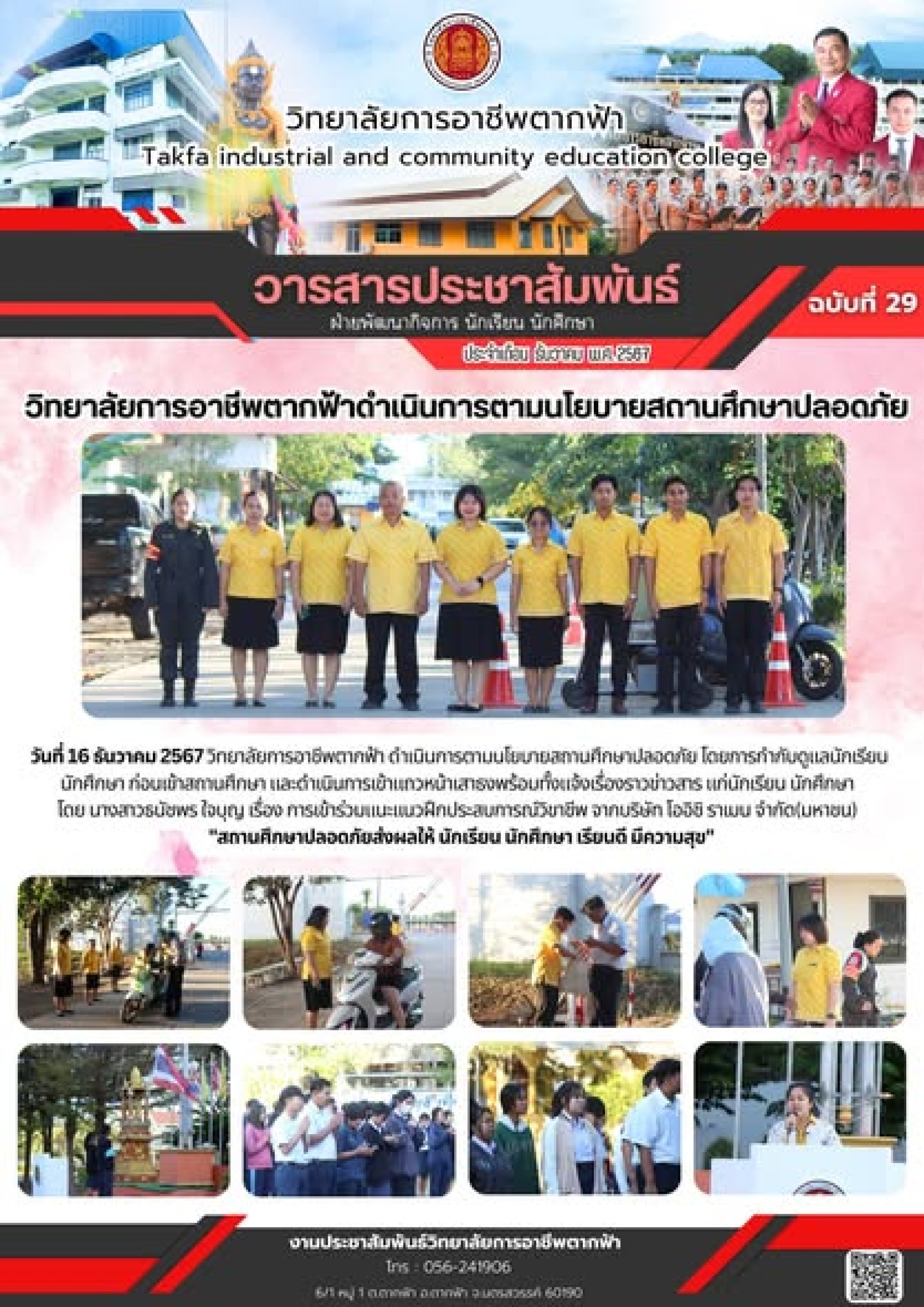 วารสารตากฟ้า ประจำเดือน ธันวาคม 2567 ฉบับที่ 29 วิทยาลัยการอาชีพตากฟ้าดำเนินการตามนโยบายสถานศึกษาปลอดภัย