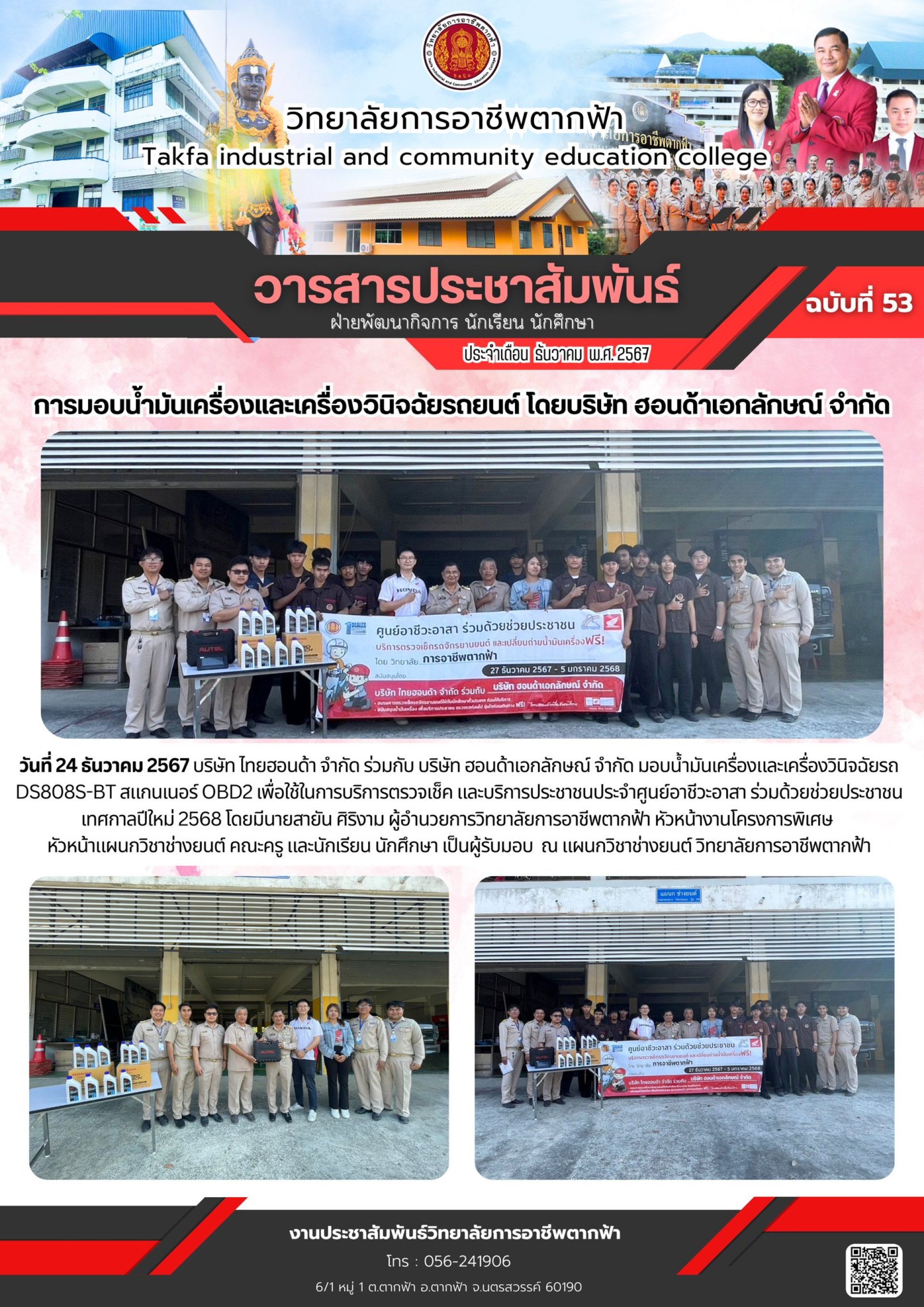 วารสารตากฟ้า ประจำเดือน ธันวาคม 2567 ฉบับที่ 53 การมอบน้ำมันเครื่องและเครื่องวินิจฉัยรถยนต์ โดยบริษัท ฮอนด้าเอกลักษณ์ จำกัด