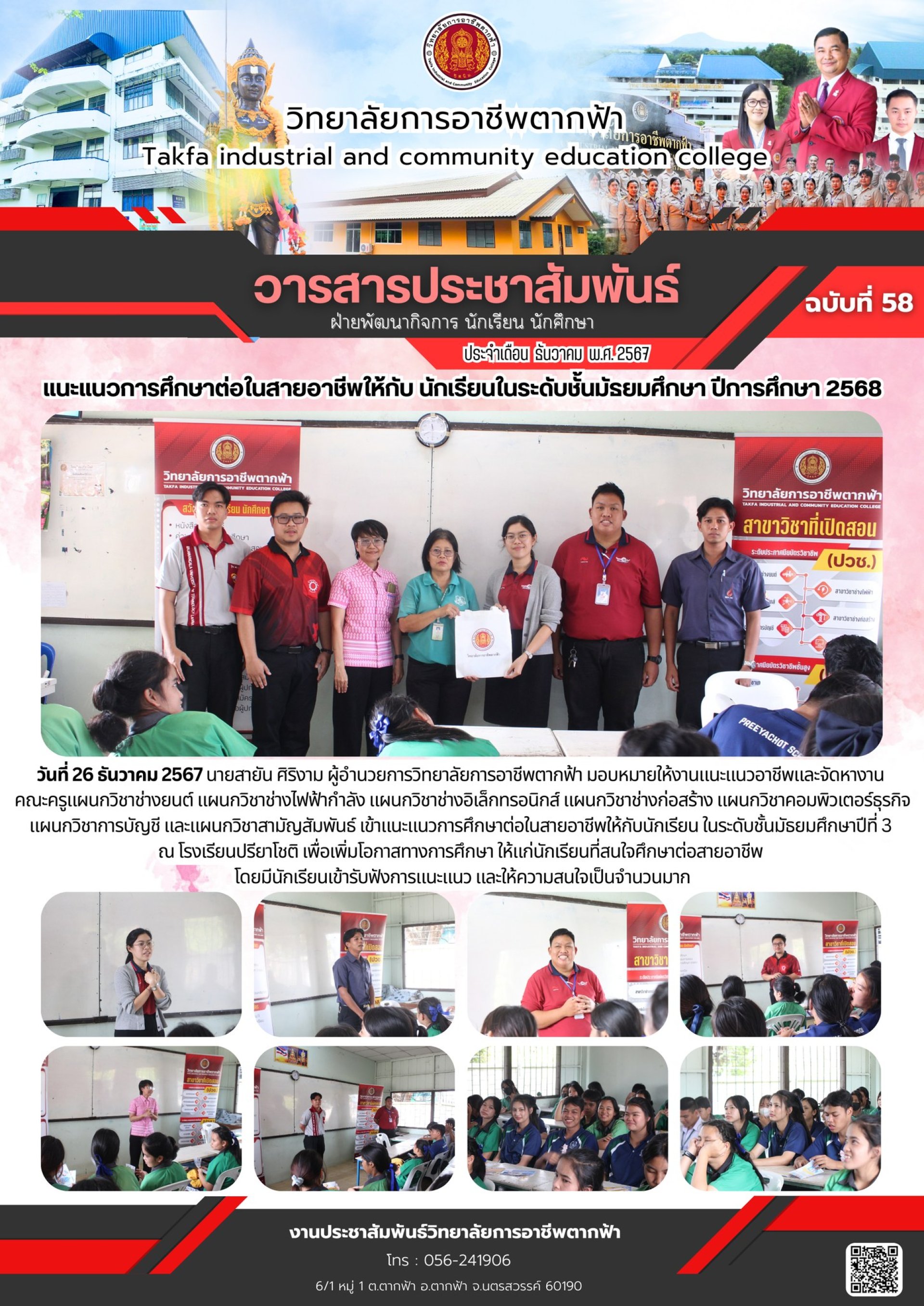 วารสารตากฟ้า ประจำเดือน ธันวาคม 2567 ฉบับที่ 58 แนะแนวการศึกษาต่อในสายอาชีพให้กับ นักเรียนในระดับชั้นมัธยมศึกษา ปีการศึกษา 2568