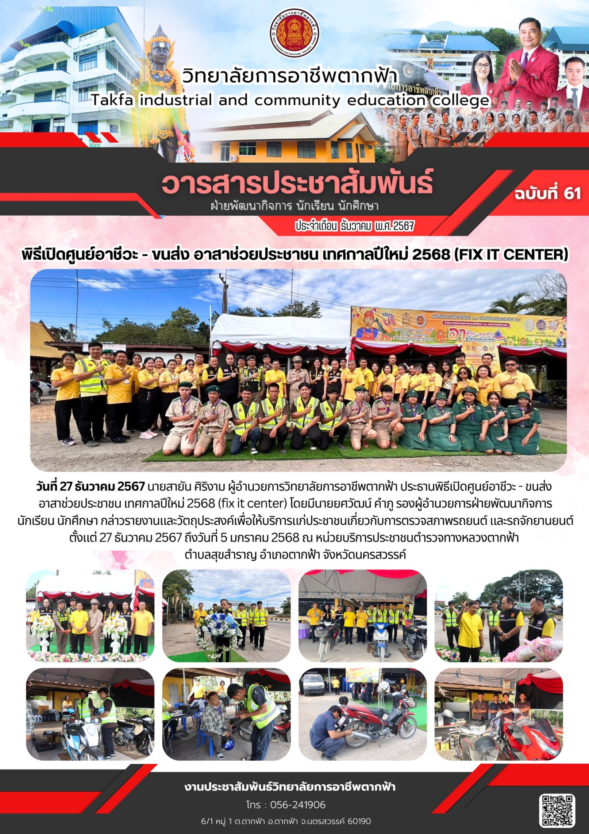 วารสารตากฟ้า ประจำเดือน ธันวาคม 2567 ฉบับที่ 61 พิธีเปิดศูนย์อาชีวะ - ขนส่ง อาสาช่วยประชาชน เทศกาลปีใหม่ 2568 (fix it center)