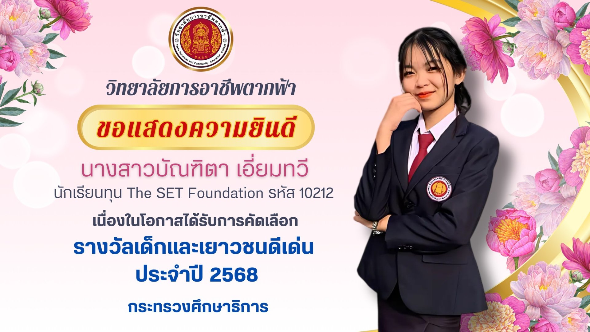 เนื่องในโอกาสได้รับการคัดเลือก "รางวัลเด็กและเยาวชนดีเด่น ประจำปี 2568" จากกระทรวงศึกษาธิการ