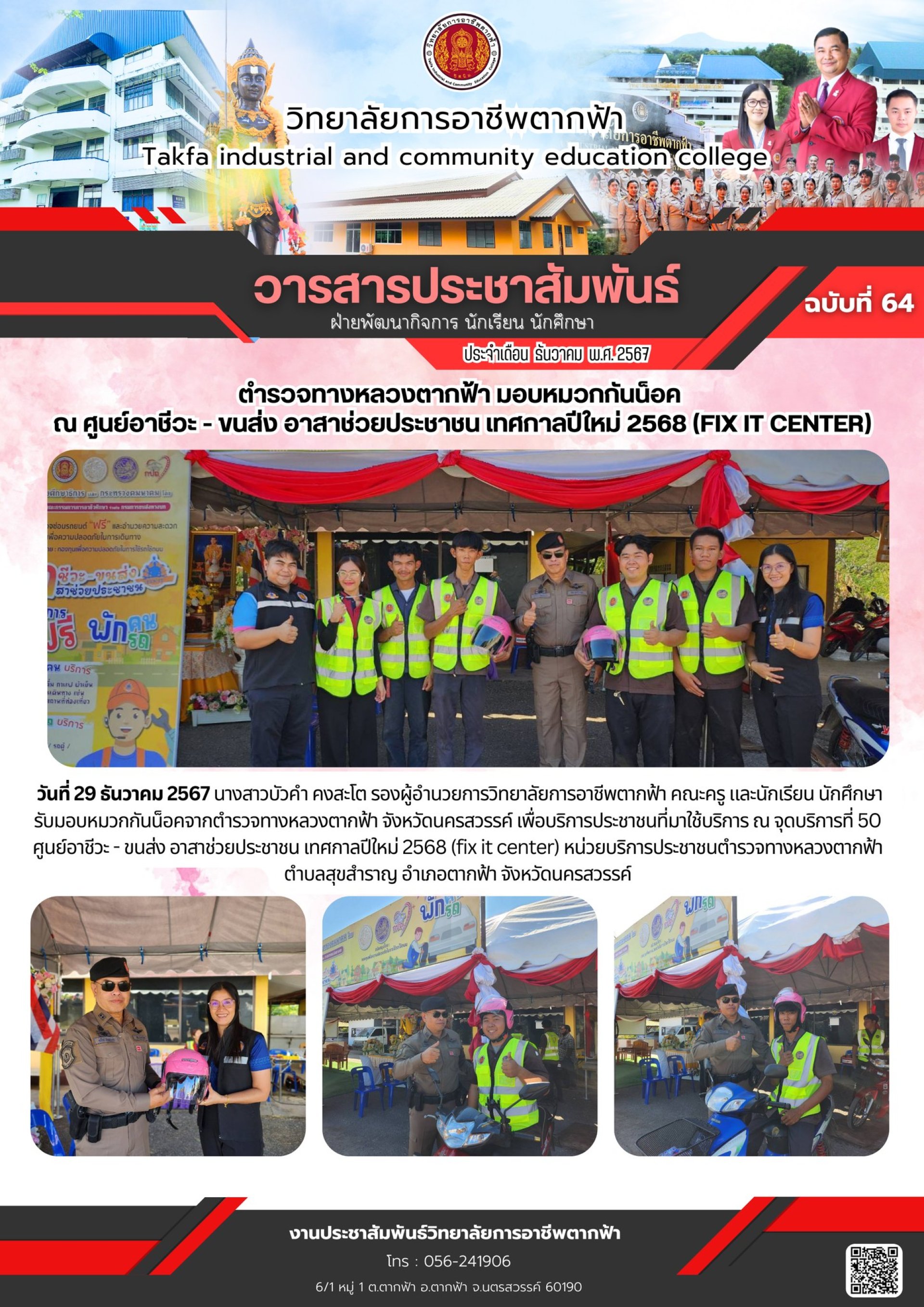 วารสารตากฟ้า ประจำเดือน ธันวาคม 2567 ฉบับที่ 64 ตำรวจทางหลวงตากฟ้า มอบหมวกกันน็อค ณ ศูนย์อาชีวะ - ขนส่ง อาสาช่วยประชาชน เทศกาลปีใหม่ 2568 (fix it center)