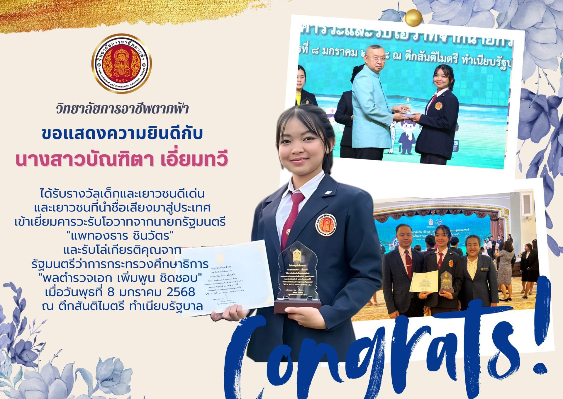 วิทยาลัยการอาชีพตากฟ้า ขอแสดงความยินดีกับนางสาวบัณฑิตา เอี่ยมทวี นักเรียนระดับชั้น ปวช.3 สาขาวิชาการบัญชี