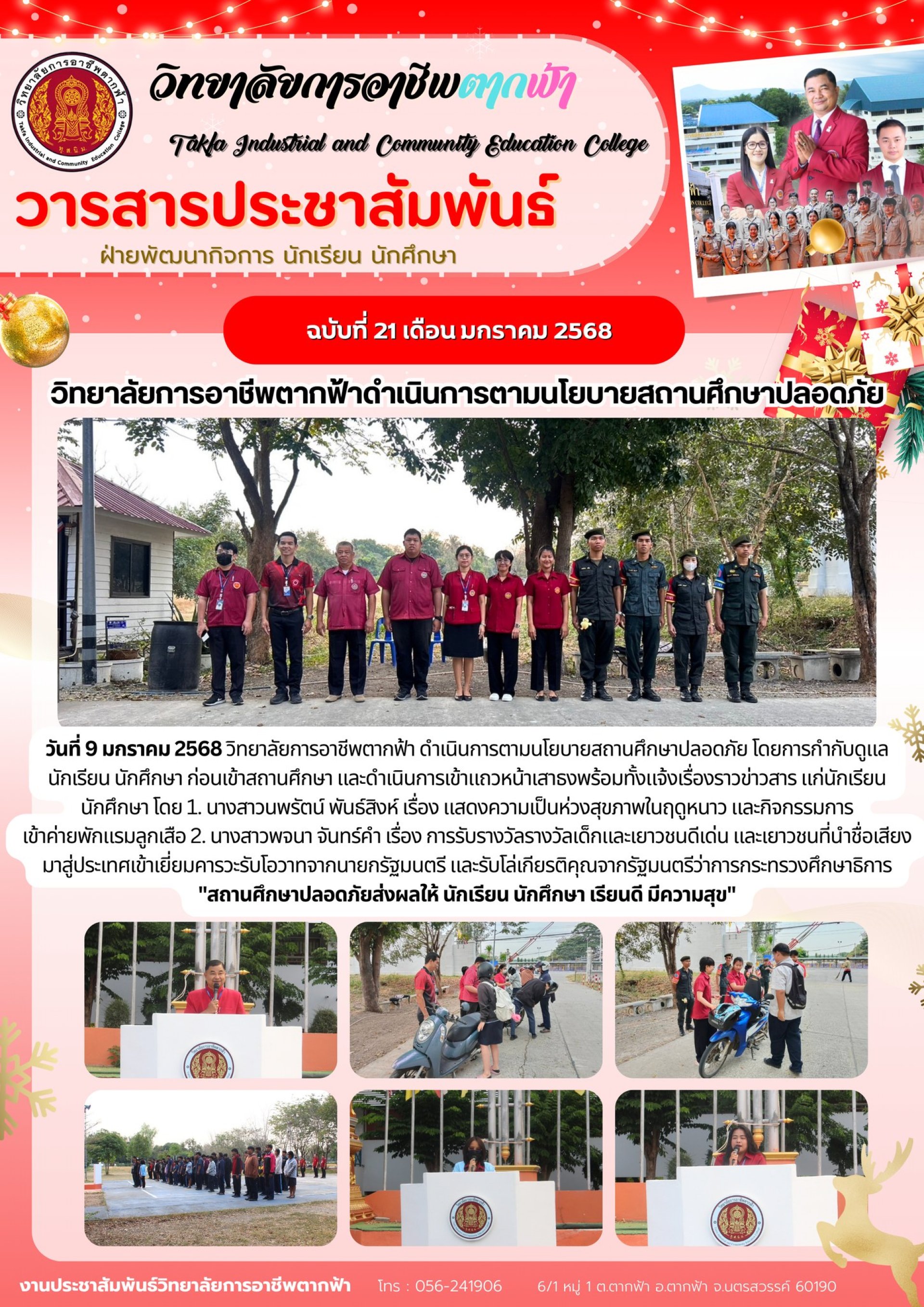 วารสารตากฟ้า ประจำเดือน มกราคม 2568 ฉบับที่ 21 วิทยาลัยการอาชีพตากฟ้าดำเนินการตามนโยบายสถานศึกษาปลอดภัย