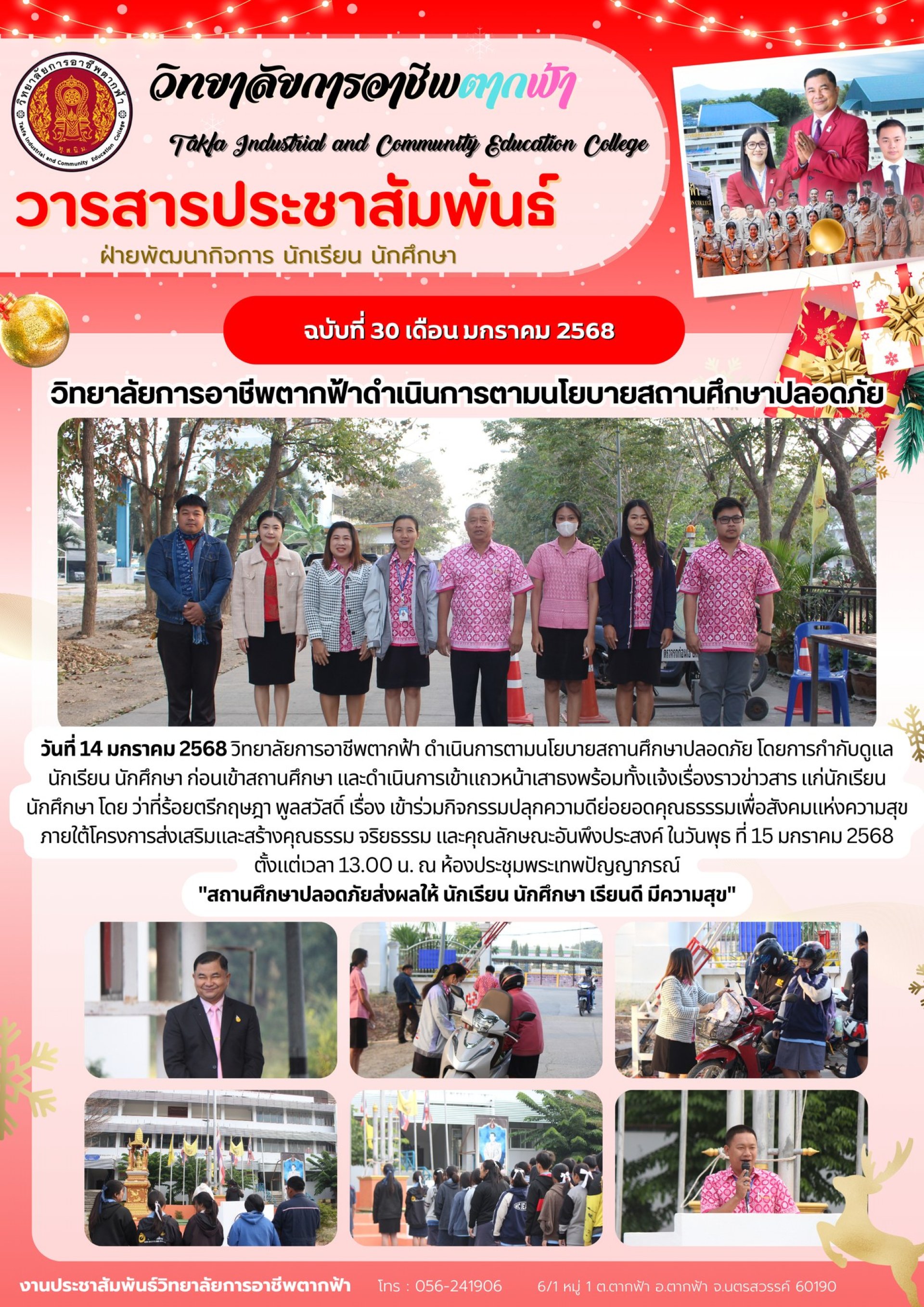 วารสารตากฟ้า ประจำเดือน มกราคม 2568 ฉบับที่ 30 วิทยาลัยการอาชีพตากฟ้าดำเนินการตามนโยบายสถานศึกษาปลอดภัย