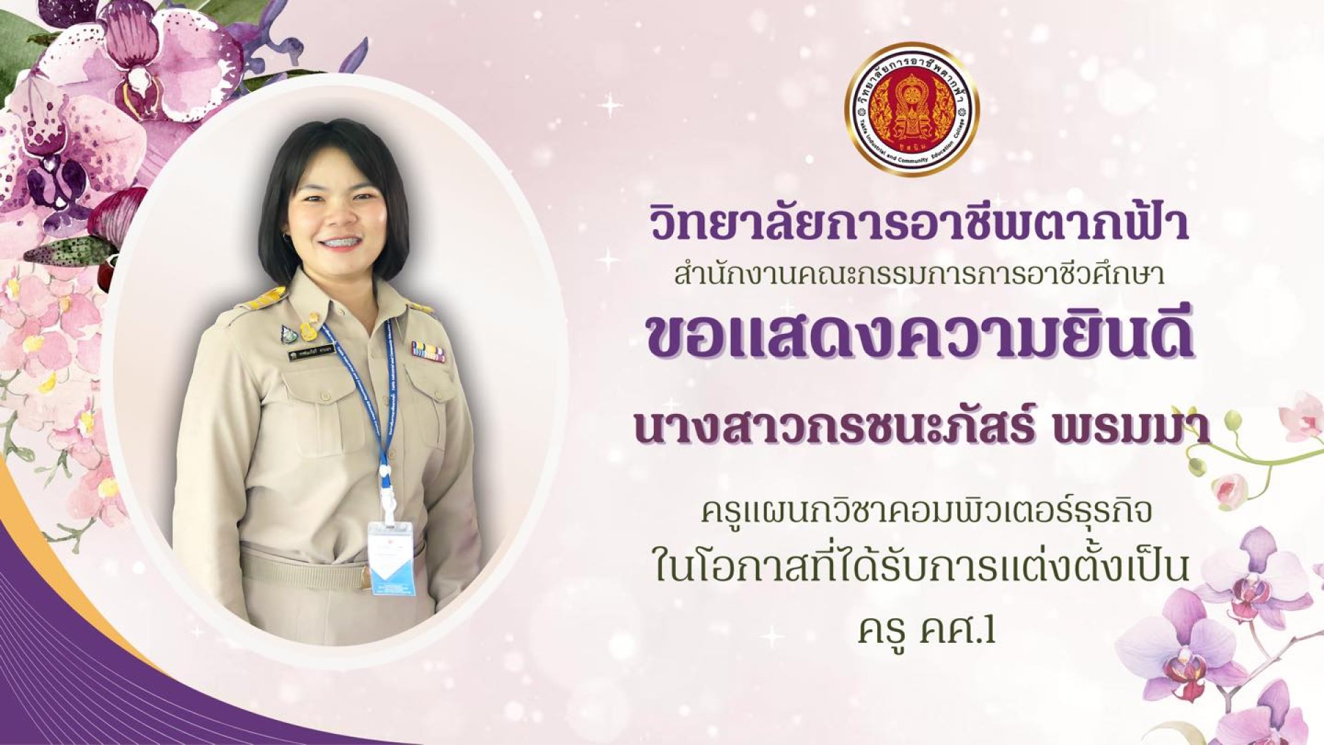 วิทยาลัยการอาชีพตากฟ้า ขอแสดงความยินดีกับ นางสาวกรชนะภัสร์ พรมมา ครูแผนกวิชาคอมพิวเตอร์ธุรกิจ ในโอกาสที่ได้รับการแต่งตั้งเป็น ครู คศ.1 ด้วยความยินดียิ่ง