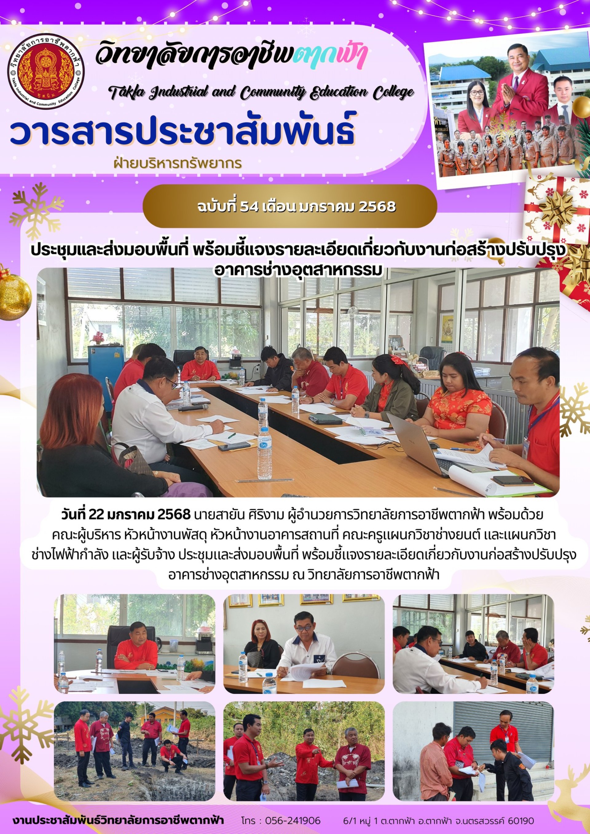 วารสารตากฟ้า ประจำเดือน มกราคม 2568 ฉบับที่ 54 ประชุมและส่งมอบพื้นที่ พร้อมชี้แจงรายละเอียดเกี่ยวกับงานก่อสร้างปรับปรุงอาคารช่างอุตสาหกรรม
