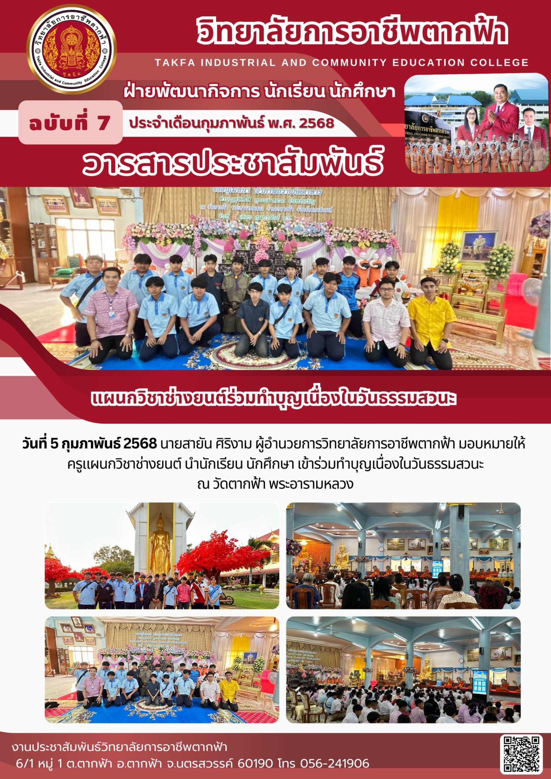 วารสารตากฟ้า ประจำเดือน กุมภาพันธ์ 2568 ฉบับที่ 7 แผนกวิชาช่างยนต์ร่วมทำบุญเนื่องในวันธรรมสวนะ