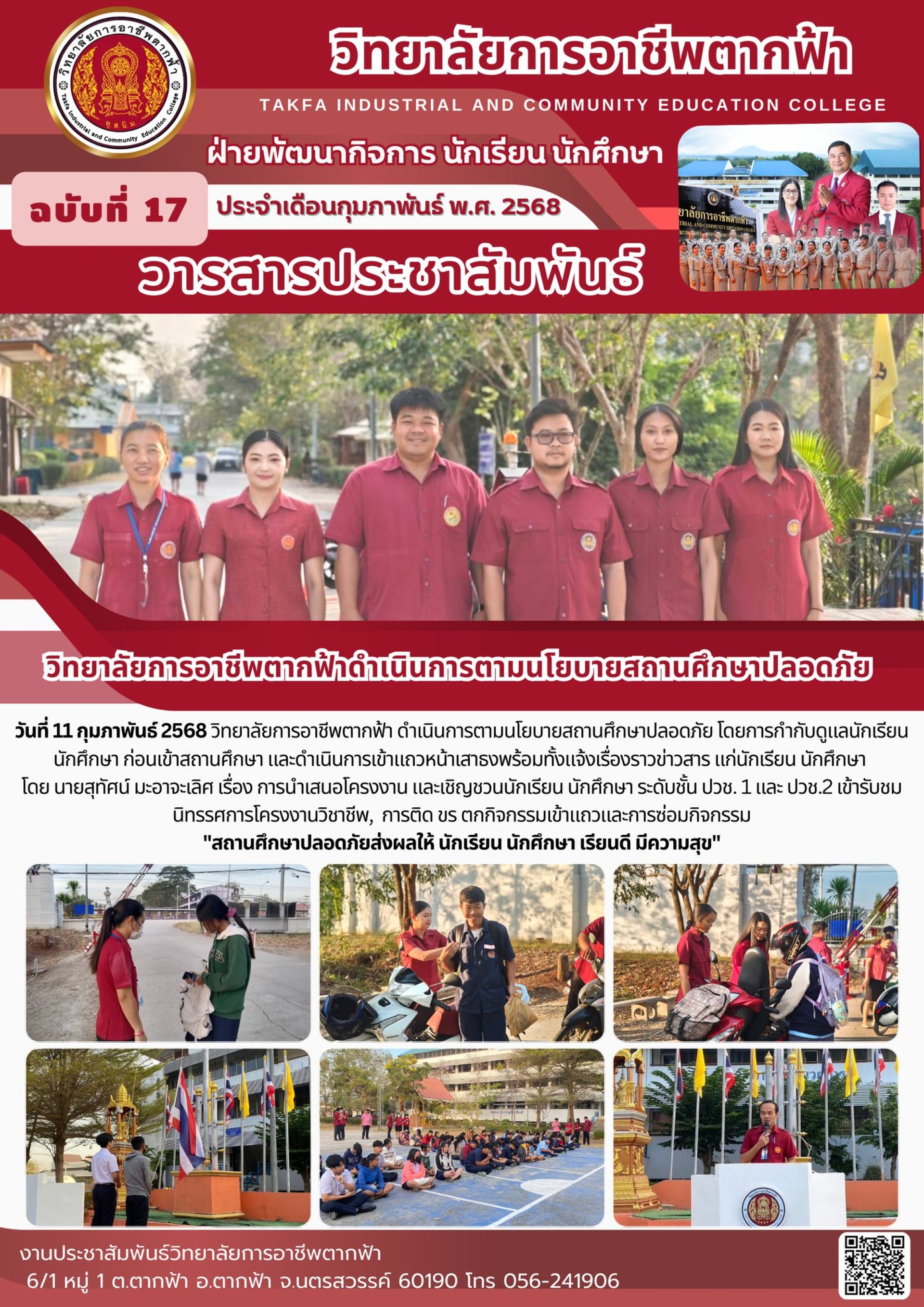 วารสารตากฟ้า ประจำเดือน กุมภาพันธ์ 2568 ฉบับที่ 17 วิทยาลัยการอาชีพตากฟ้าดำเนินการตามนโยบายสถานศึกษาปลอดภัย