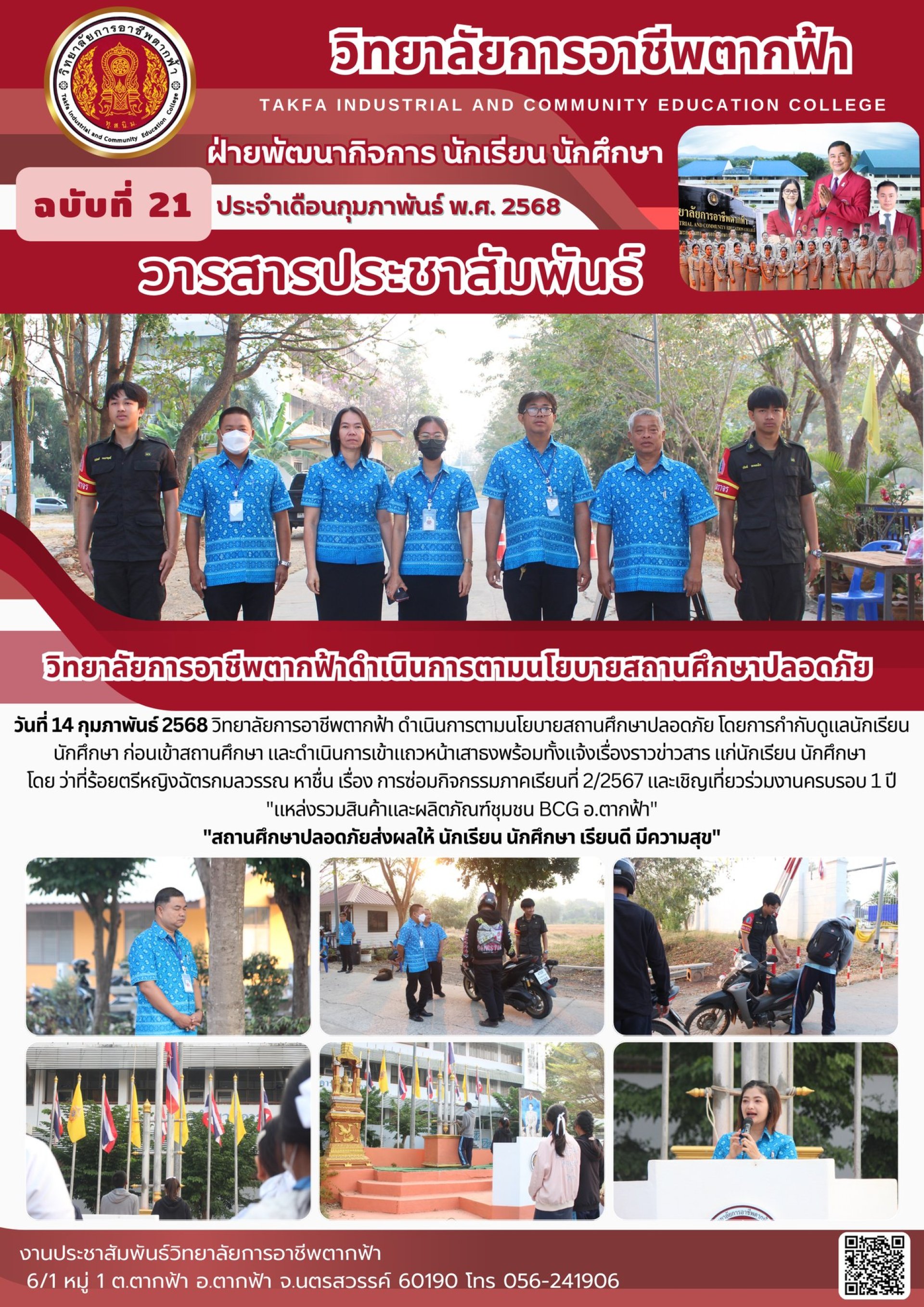 วารสารตากฟ้า ประจำเดือน กุมภาพันธ์ 2568 ฉบับที่ 21 วิทยาลัยการอาชีพตากฟ้าดำเนินการตามนโยบายสถานศึกษาปลอดภัย