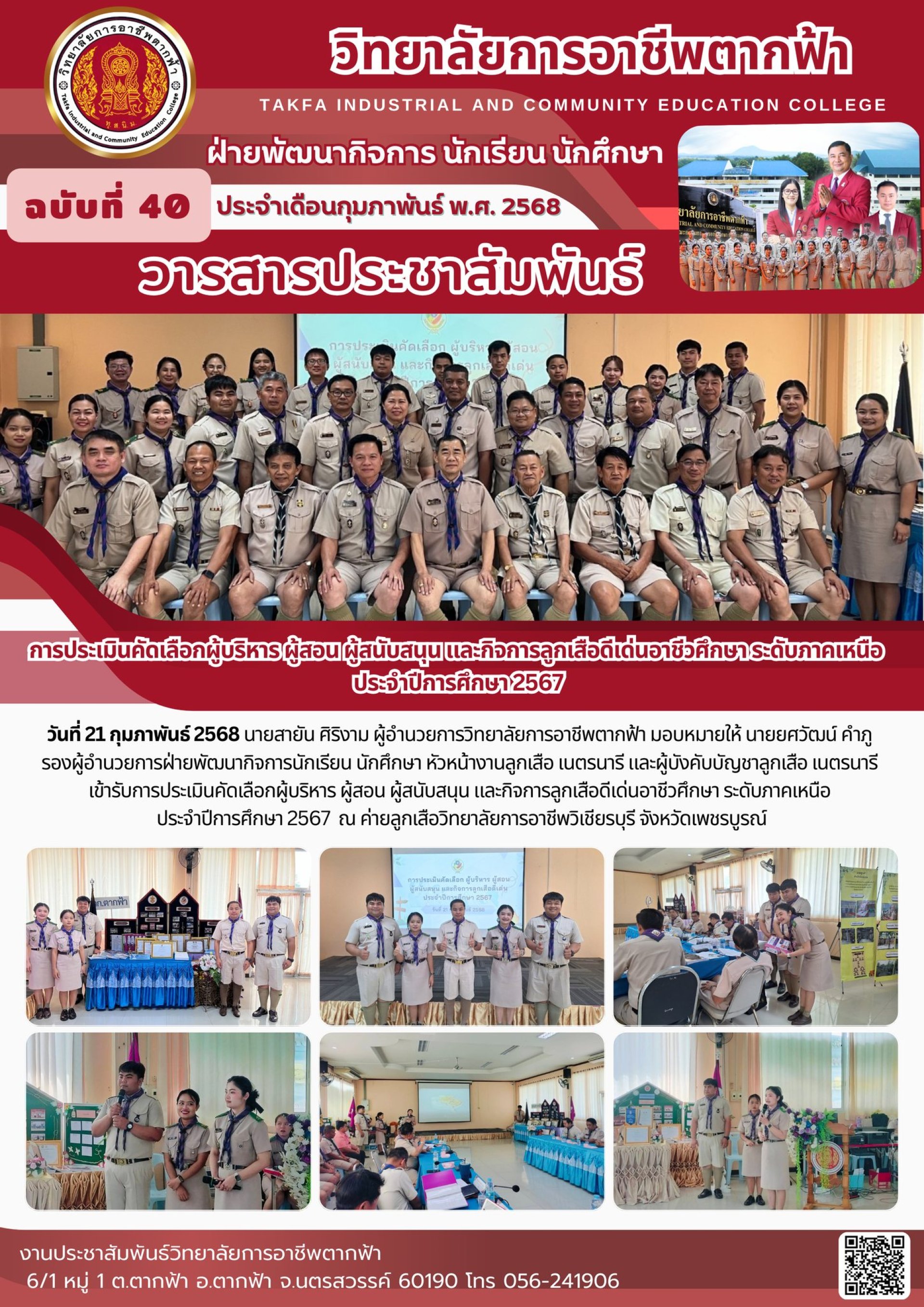 วารสารตากฟ้า ประจำเดือน กุมภาพันธ์ 2568 ฉบับที่ 40 การประเมินคัดเลือกผู้บริหาร ผู้สอน ผู้สนับสนุน และกิจการลูกเสือดีเด่นอาชีวศึกษา ระดับภาคเหนือ ประจำปีการศึกษา 2567
