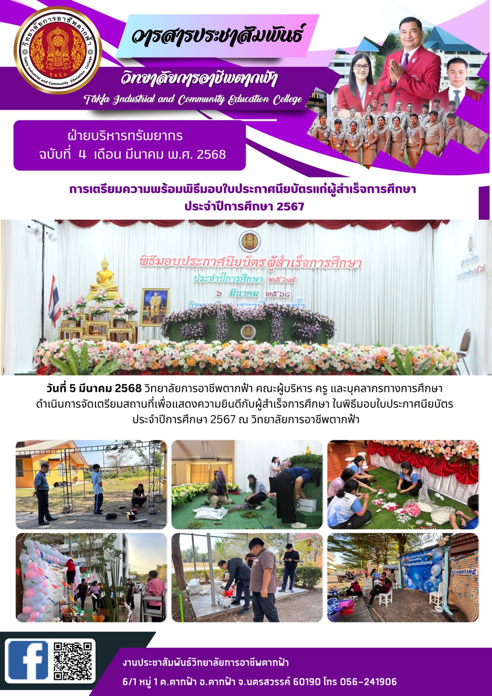วารสารตากฟ้า ประจำเดือน มีนาคม 2568 ฉบับที่ 4 การเตรียมความพร้อมพิธีมอบใบประกาศนียบัตรแก่ผู้สำเร็จการศึกษาประจำปีการศึกษา 2567