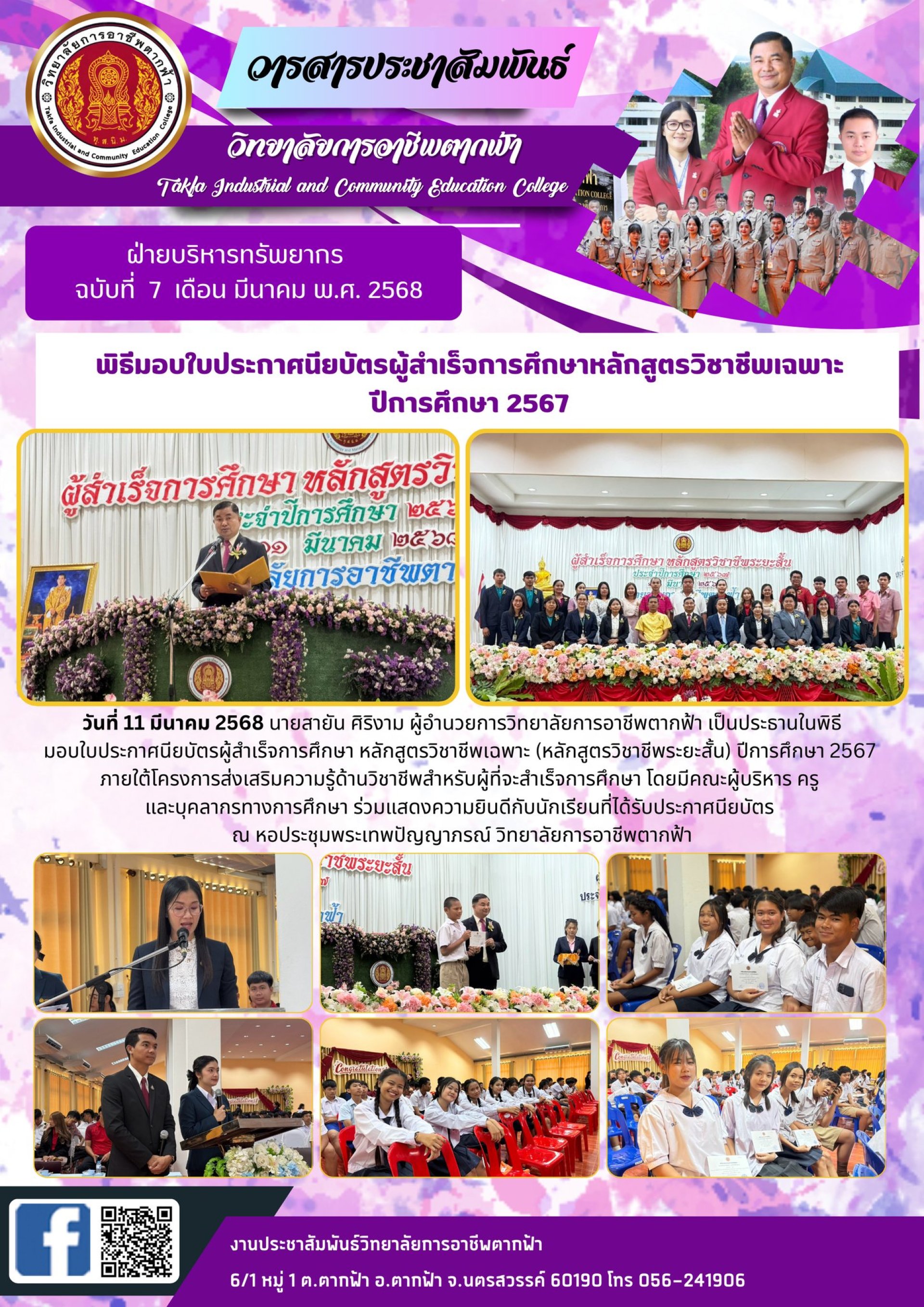 วารสารตากฟ้า ประจำเดือน มีนาคม 2568 ฉบับที่ 7 พิธีมอบใบประกาศนียบัตรผู้สำเร็จการศึกษาหลักสูตรวิชาชีพเฉพาะ ปีการศึกษา 2567