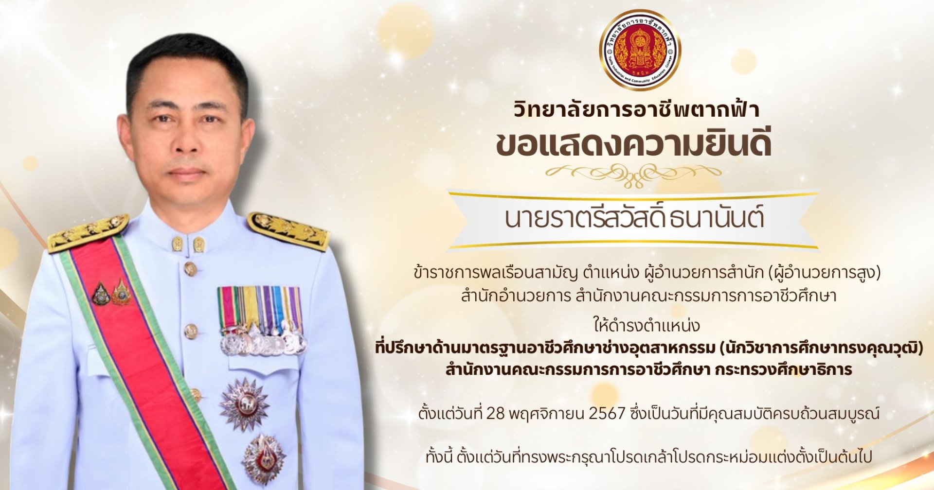 วิทยาลัยการอาชีพตากฟ้า ขอแสดงความยินดีกับ นายราตรีสวัสดิ์ ธนานันต์ ข้าราชการพลเรือนสามัญ ตำแหน่ง ผู้อำนวยการสำนัก (ผู้อำนวยการสูง) สำนักอำนวยการ สำนักงานคณะกรรมการการอาชีวศึกษา