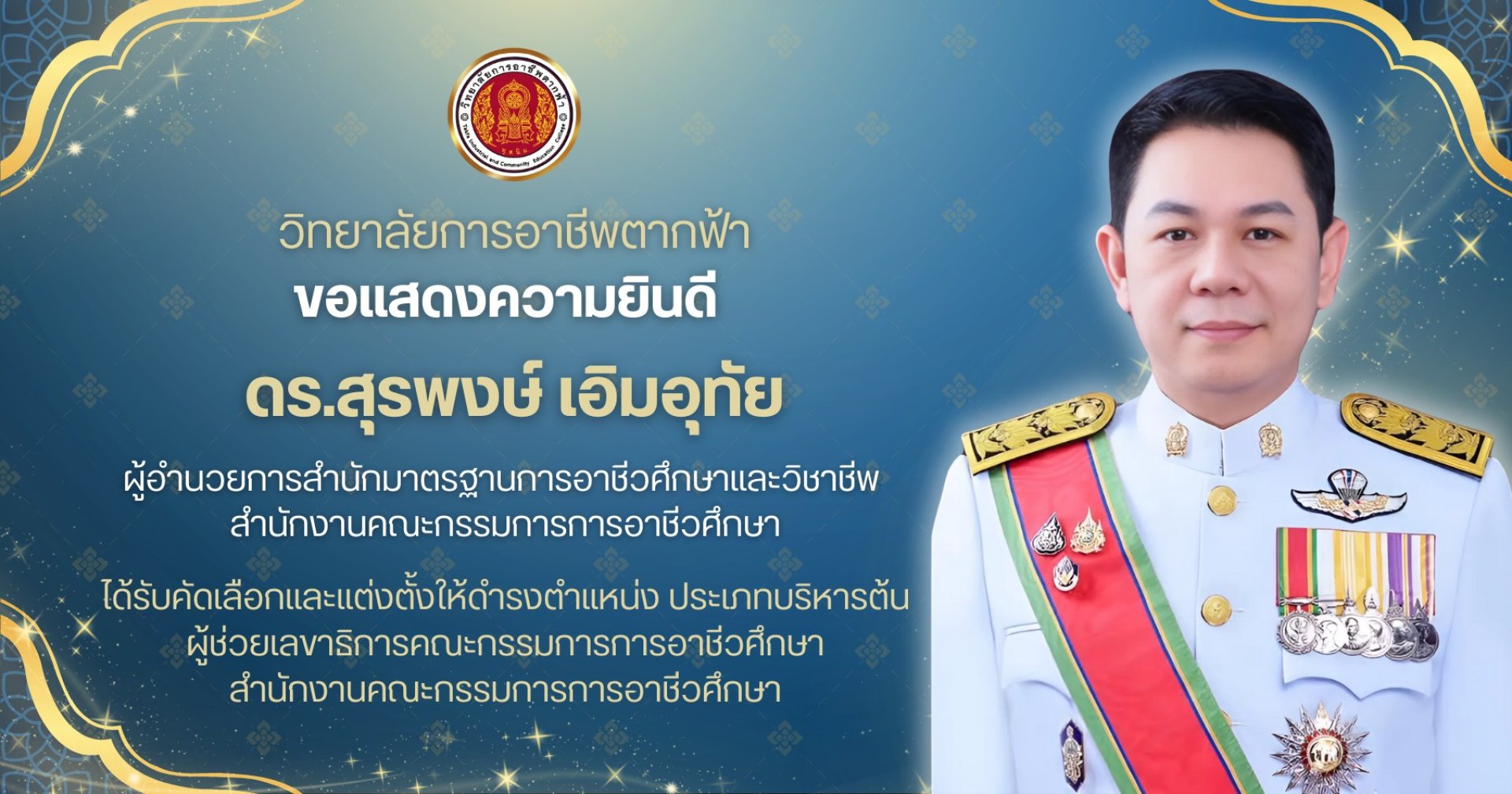 วิทยาลัยการอาชีพตากฟ้า ขอแสดงความยินดีอย่างยิ่งกับ ดร.สุรพงษ์ เอิมอุทัย ผู้อำนวยการสำนักมาตรฐานการอาชีวศึกษาและวิชาชีพ สำนักงานคณะกรรมการการอาชีวศึกษา ได้รับคัดเลือกและแต่งตั้งให้ดำรงตำแหน่ง ผู้ช่วยเลขาธิการคณะกรรมการการอาชีวศึกษา สำนักงานคณะกรรมการการอาช