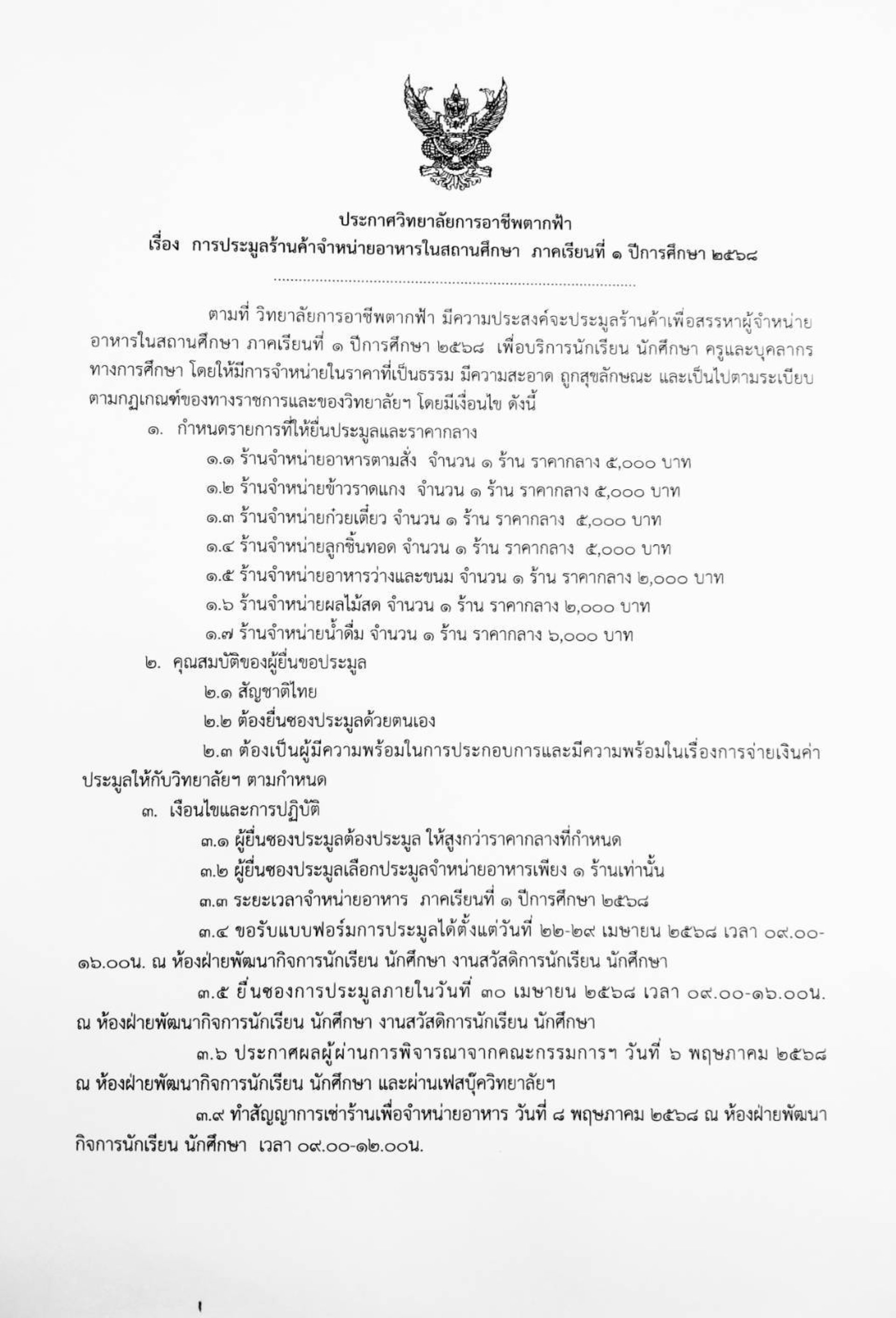 ประกาศวิทยาลัยการอาชีพตากฟ้า แจ้งการแก้ไขประกาศ การประมูลร้านค้าจำหน่ายอาหารในสถานศึกษา ภาคเรียนที่ 1 ปีการศึกษา 2568 ประกาศผลผู้ผ่านการพิจารณาจากคณะกรรมการฯ ในวันที่ 6 พฤษภาคม 2568