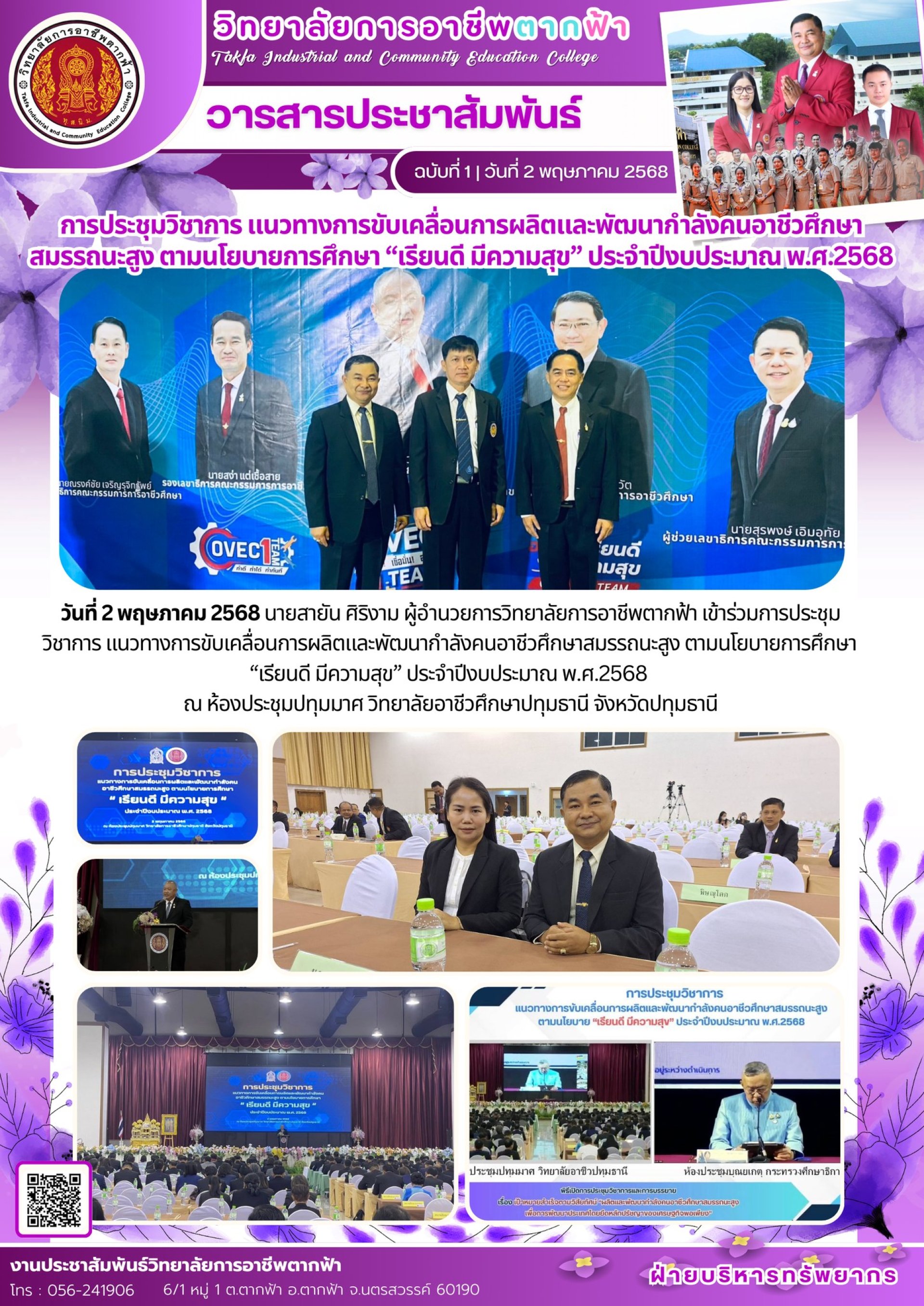 วารสารตากฟ้า ประจำเดือน พฤษภาคม 2568 ฉบับที่ 1 การประชุมวิชาการ แนวทางการขับเคลื่อนการผลิตและพัฒนากำลังคนอาชีวศึกษาสมรรถนะสูง ตามนโยบายการศึกษา เรียนดี มีความสุข ประจำปีงบประมาณ พ.ศ.2568