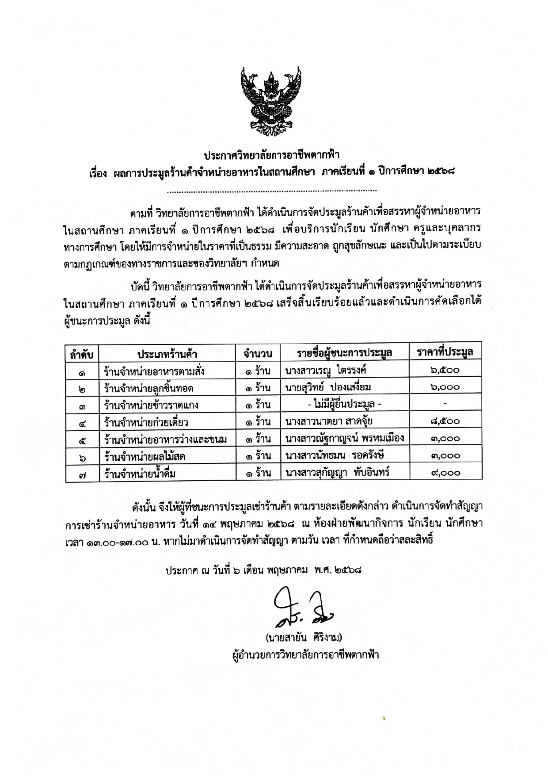 ประกาศวิทยาลัยการอาชีพตากฟ้า เรื่อง ผลการประมูลร้านค้าจำหน่ายอาหารในสถานศึกษา ภาคเรียนที่ 1 ปีการศึกษา 2568 - ดำเนินการจัดทำสัญญาการเช่าจำหน่ายอาหาร ในวันที่ 14 พฤษภาคม 2568 เวลา 13.00-17.00 น. หากไม่มาดำเนินการจัดทำสัญญาตามวัน เวลาที่กำหนดถือว่าสละสิทธิ์
