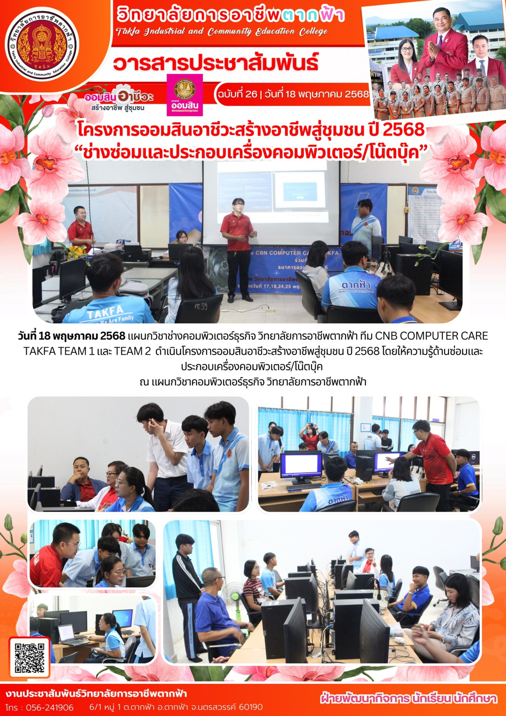 วันที่ 18 พฤษภาคม 2568 แผนกวิชาช่างคอมพิวเตอร์ธุรกิจ วิทยาลัยการอาชีพตากฟ้า ทีม CNB COMPUTER CARE TAKFA TEAM 1 และ TEAM 2 ดำเนินโครงการออมสินอาชีวะสร้างอาชีพสู่ชุมชน ปี 2568 โดยให้ความรู้ด้านซ่อมและประกอบเครื่องคอมพิวเตอร์/โน๊ตบุ๊ค ณ แผนกวิชาคอมพิวเตอร์ธุรกิจ วิทยาลัยการอาชีพตากฟ้า