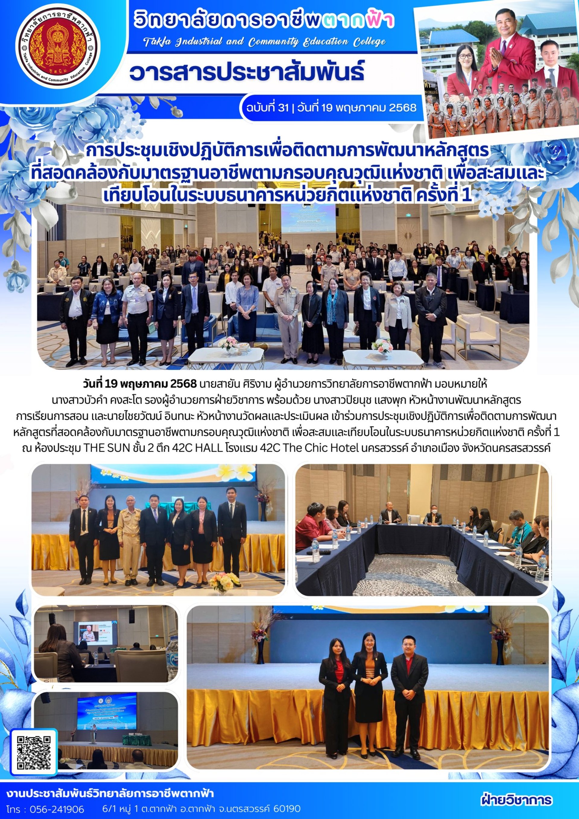 วารสารตากฟ้า ประจำเดือน พฤษภาคม 2568 ฉบับที่ 31 การประชุมเชิงปฏิบัติการเพื่อติดตามการพัฒนาหลักสูตรที่สอดคล้องกับมาตรฐานอาชีพตามกรอบคุณวุฒิแห่งชาติ เพื่อสะสมและเทียบโอนในระบบธนาคารหน่วยกิตแห่งชาติ ครั้งที่ 1