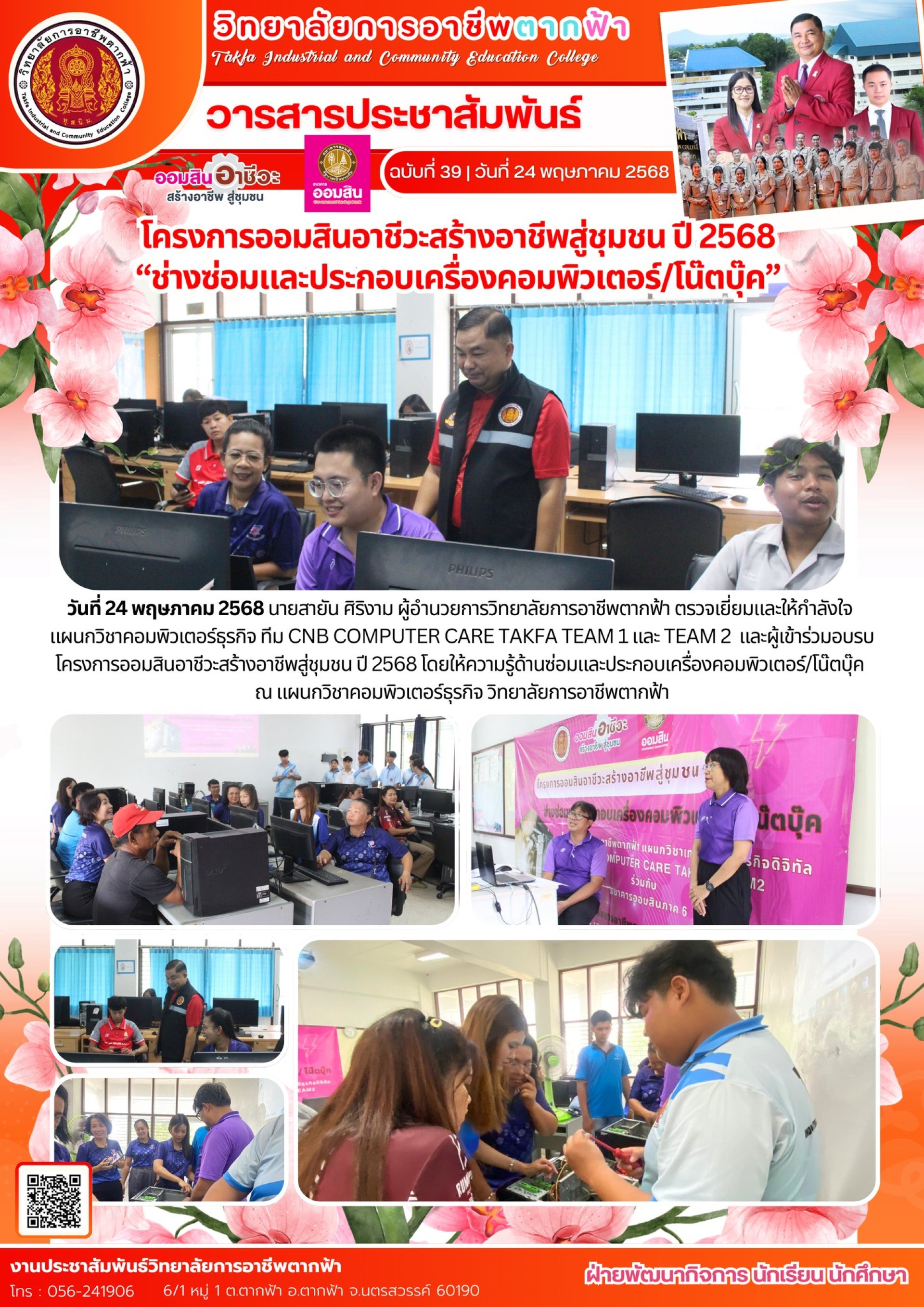 วันที่ 24 พฤษภาคม 2568 นายสายัน ศิริงาม ผู้อำนวยการวิทยาลัยการอาชีพตากฟ้า ตรวจเยี่ยมและให้กำลังใจ แผนกวิชาคอมพิวเตอร์ธุรกิจ ทีม CNB COMPUTER CARE TAKFA TEAM 1 และ TEAM 2 และผู้เข้าร่วมอบรบโครงการออมสินอาชีวะสร้างอาชีพสู่ชุมชน ปี 2568 โดยให้ความรู้ด้านซ่อมและประกอบเครื่องคอมพิวเตอร์/โน๊ตบุ๊ค ณ แผนกวิชาคอมพิวเตอร์ธุรกิจ วิทยาลัยการอาชีพตากฟ้า
