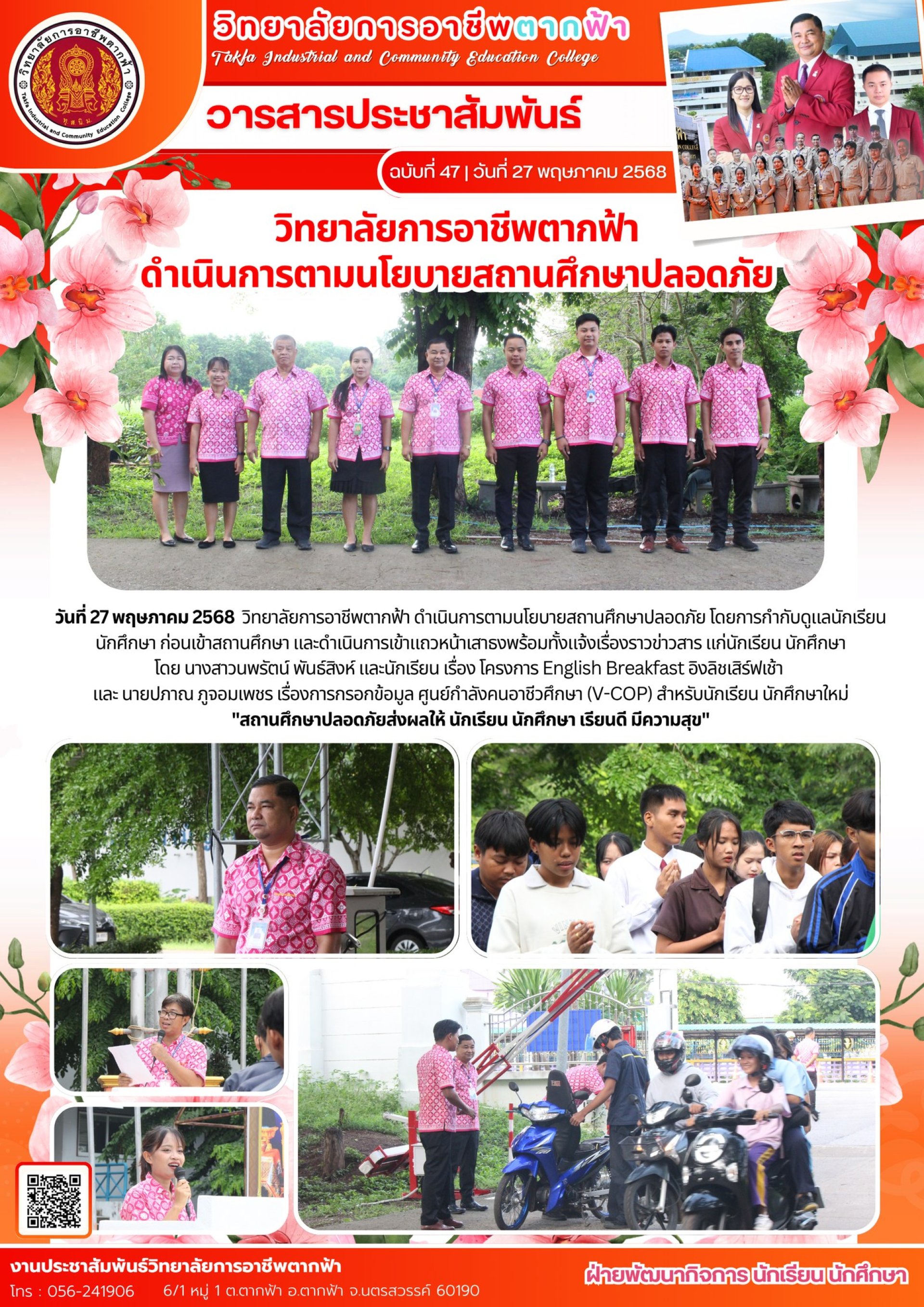 วารสารตากฟ้า ประจำเดือน พฤษภาคม 2568 ฉบับที่ 47 วิทยาลัยการอาชีพตากฟ้า ดำเนินการตามนโยบายสถานศึกษาปลอดภัย