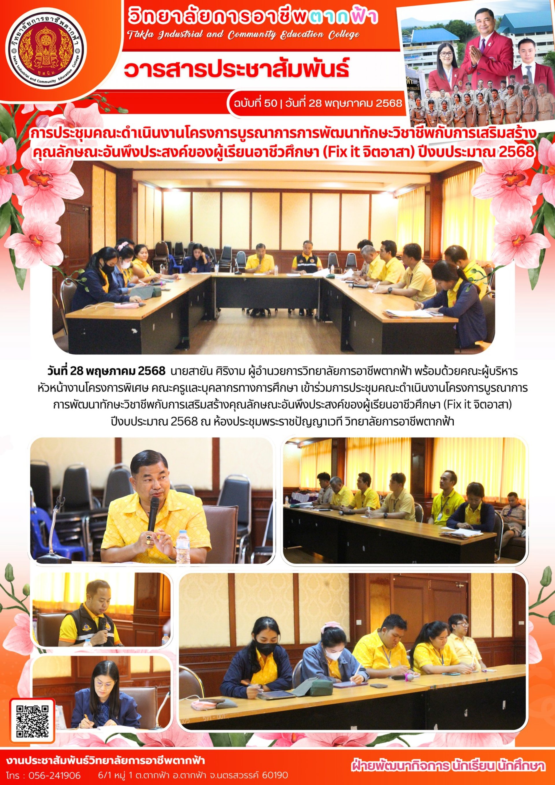 วารสารตากฟ้า ประจำเดือน พฤษภาคม 2568 ฉบับที่ 50 การประชุมคณะดำเนินงานโครงการบูรณาการการพัฒนาทักษะวิชาชีพกับการเสริมสร้างคุณลักษณะอันพึงประสงค์ของผู้เรียนอาชีวศึกษา (Fix it จิตอาสา) ปีงบประมาณ 2568