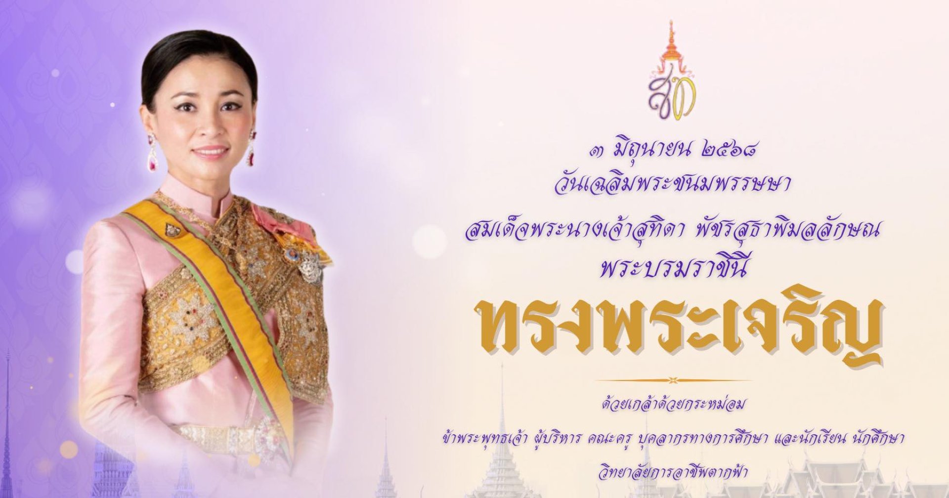 ๓ มิถุนายน ๒๕๖๘ วันเฉลิมพระชนมพรรษา สมเด็จพระนางเจ้าสุทิดา พัชรสุธาพิมลลักษณ พระบรมราชินี ขอพระองค์ทรงพระเจริญ ด้วยเกล้าด้วยกระหม่อม ขอเดชะ ข้าพระพุทธเจ้าคณะผู้บริหาร ครู บุคลากรทางการศึกษา และนักเรียน นักศึกษา วิทยาลัยการอาชีพตากฟ้า
