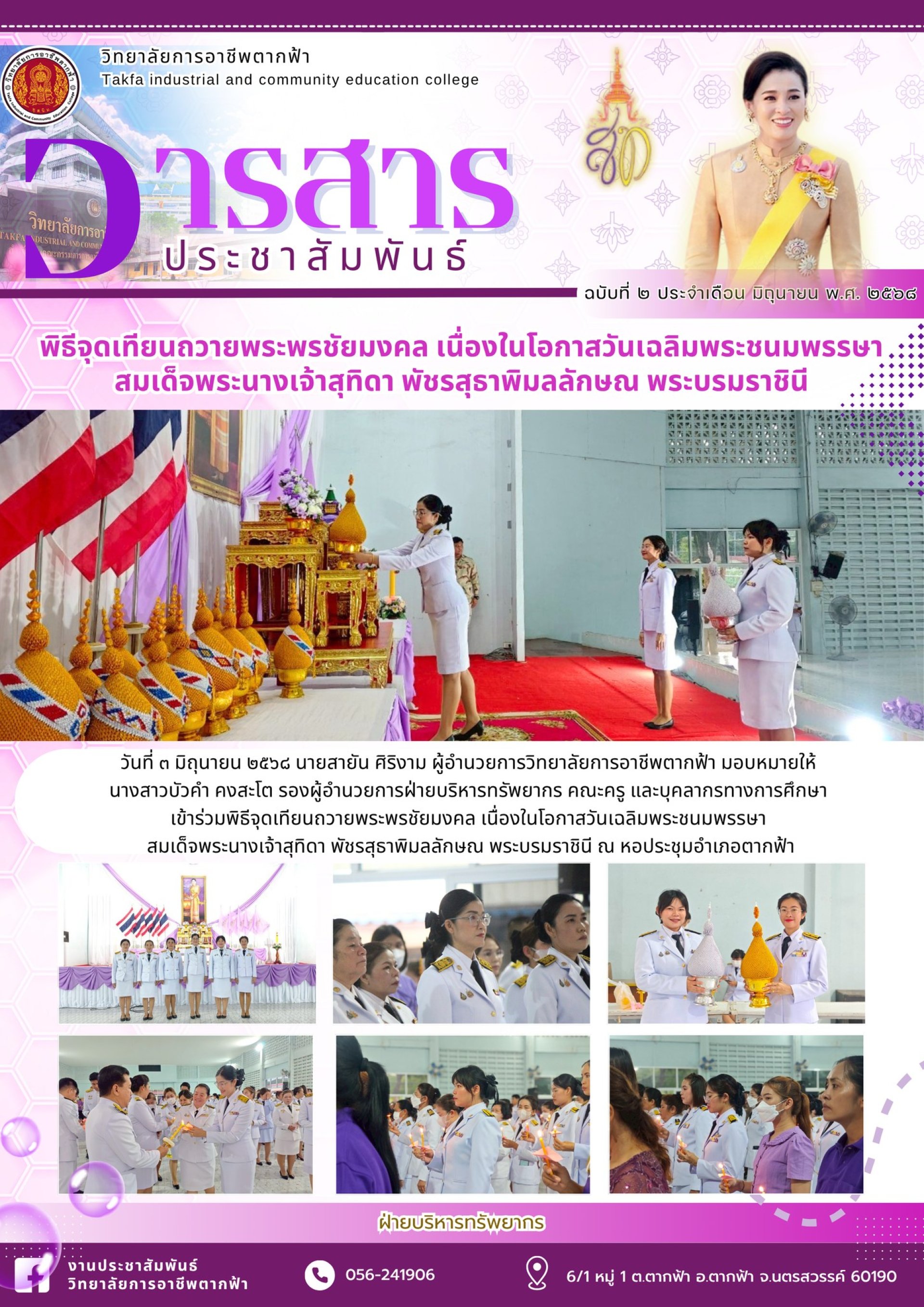 วารสารตากฟ้า ประจำเดือน มิถุนายน ๒๕๖๘ ฉบับที่ ๒ พิธีจุดเทียนถวายพระพรชัยมงคล เนื่องในโอกาสวันเฉลิมพระชนมพรรษา สมเด็จพระนางเจ้าสุทิดา พัชรสุธาพิมลลักษณ พระบรมราชินี