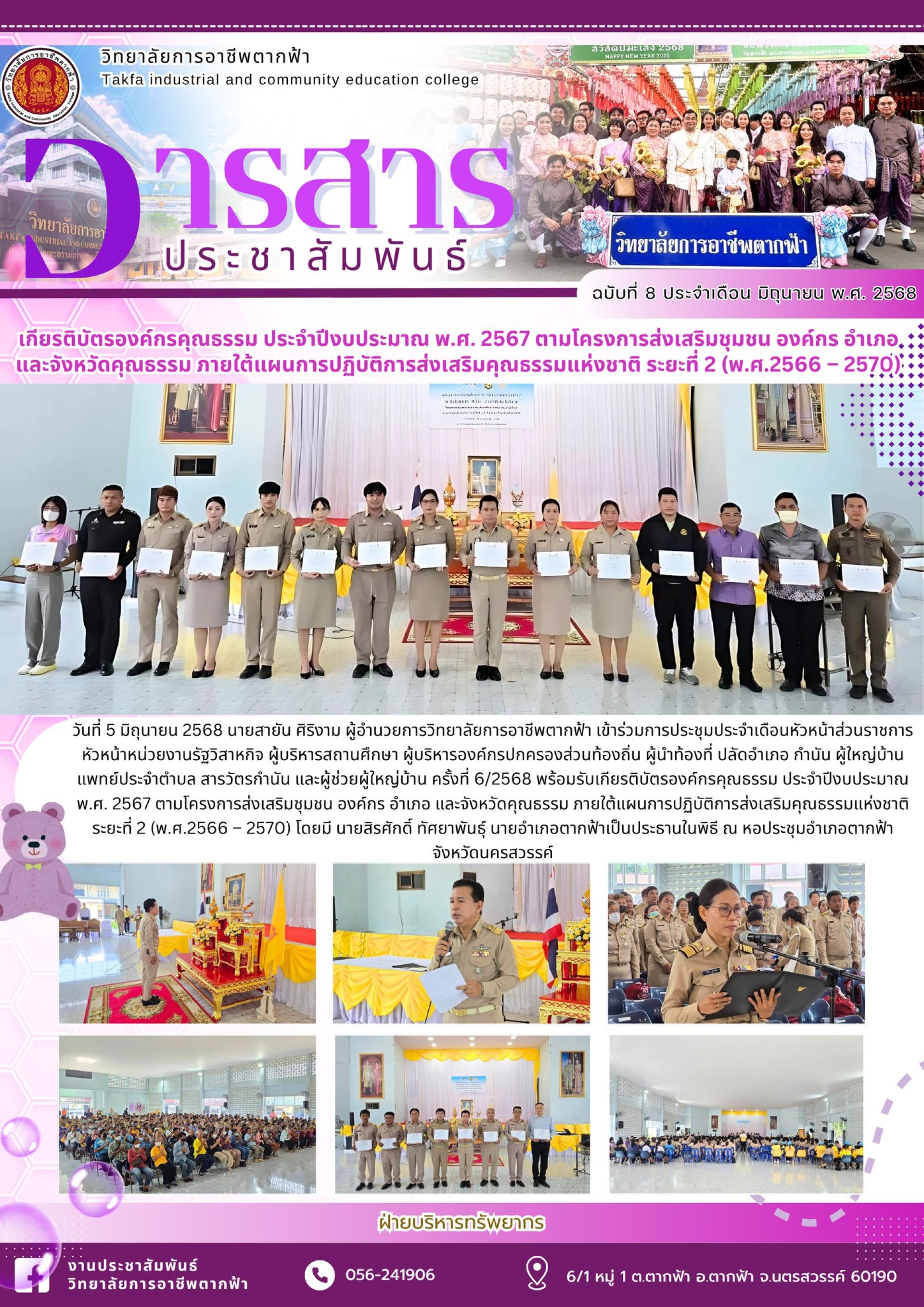 วารสารตากฟ้า ประจำเดือน มิถุนายน 2568 ฉบับที่ 8 เกียรติบัตรองค์กรคุณธรรม ประจำปีงบประมาณ พ.ศ. 2567 ตามโครงการส่งเสริมชุมชน องค์กร อำเภอ และจังหวัดคุณธรรม ภายใต้แผนการปฏิบัติการส่งเสริมคุณธรรมแห่งชาติ ระยะที่ 2 (พ.ศ.2566 2570)