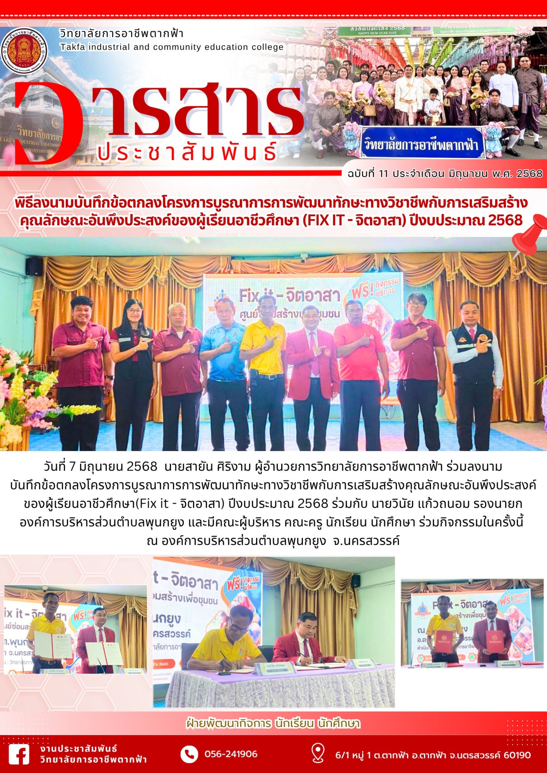วารสารตากฟ้า ประจำเดือน มิถุนายน 2568 ฉบับที่ 11 พิธีลงนามบันทึกข้อตกลงโครงการบูรณาการการพัฒนาทักษะทางวิชาชีพกับการเสริมสร้างคุณลักษณะอันพึงประสงค์ของผู้เรียนอาชีวศึกษา (Fix it - จิตอาสา) ปีงบประมาณ 2568