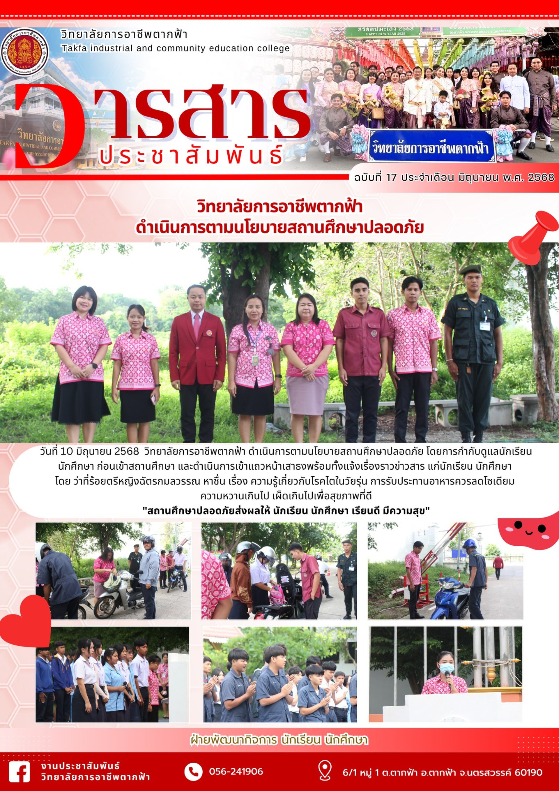 วารสารตากฟ้า ประจำเดือน มิถุนายน 2568 ฉบับที่ 17 วิทยาลัยการอาชีพตากฟ้า ดำเนินการตามนโยบายสถานศึกษาปลอดภัย