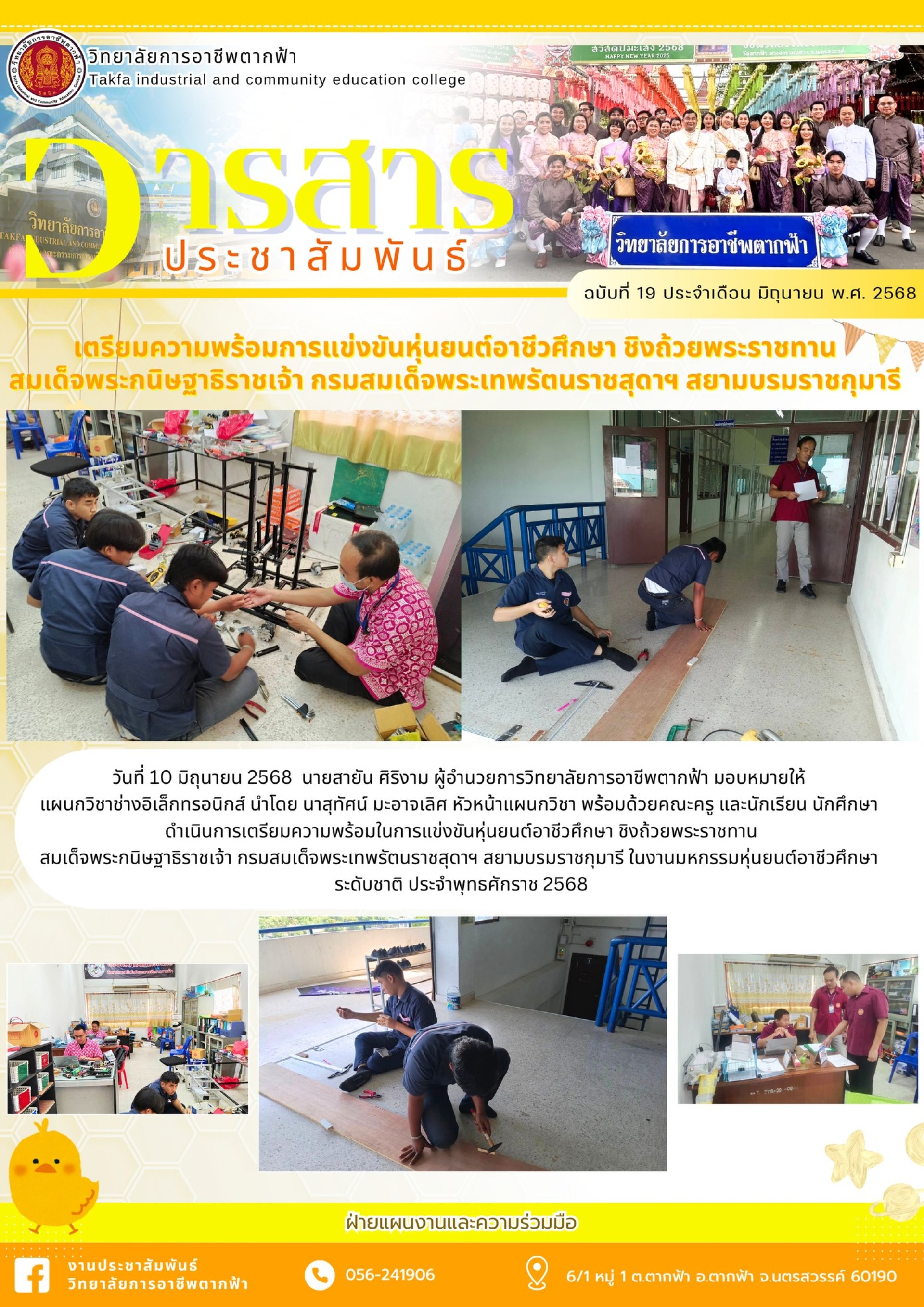 วารสารตากฟ้า ประจำเดือน มิถุนายน 2568 ฉบับที่ 19 เตรียมความพร้อมการแข่งขันหุ่นยนต์อาชีวศึกษา ชิงถ้วยพระราชทาน สมเด็จพระกนิษฐาธิราชเจ้า กรมสมเด็จพระเทพรัตนราชสุดาฯ สยามบรมราชกุมารี