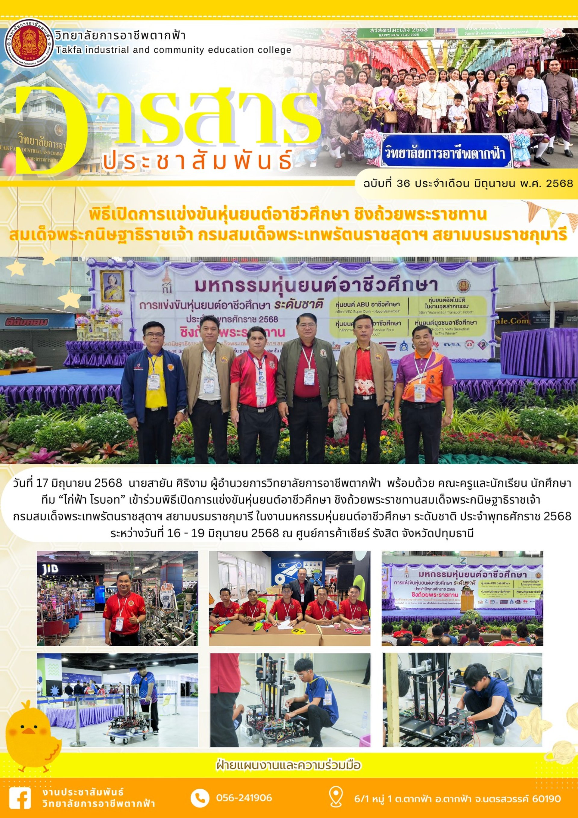 วารสารตากฟ้า ประจำเดือน มิถุนายน 2568 ฉบับที่ 36 พิธีเปิดการแข่งขันหุ่นยนต์อาชีวศึกษา ชิงถ้วยพระราชทานสมเด็จพระกนิษฐาธิราชเจ้า กรมสมเด็จพระเทพรัตนราชสุดาฯ สยามบรมราชกุมารี