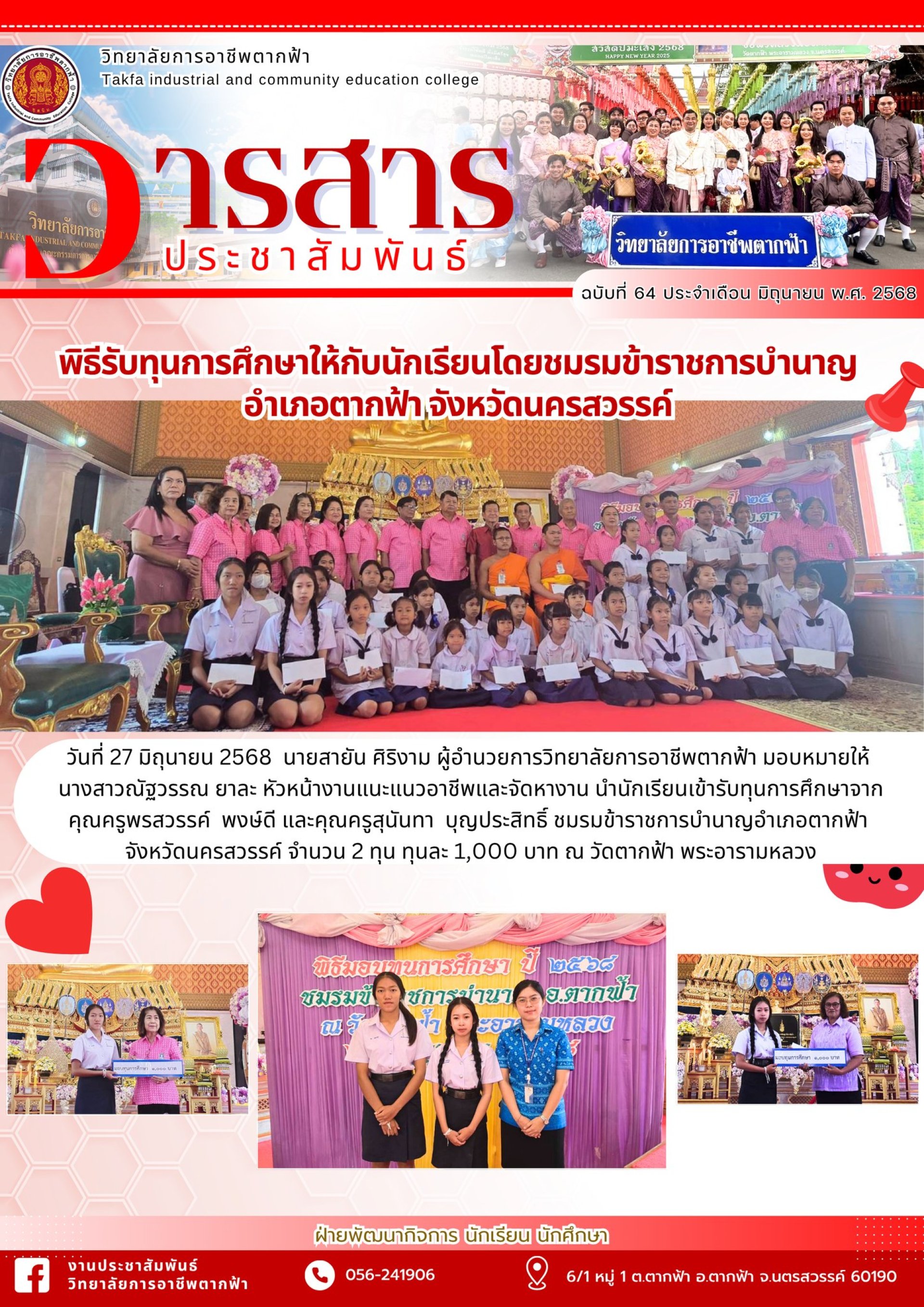 วารสารตากฟ้า ประจำเดือน มิถุนายน 2568 ฉบับที่ 64 พิธีรับทุนการศึกษาให้กับนักเรียนโดยชมรมข้าราชการบำนาญ อำเภอตากฟ้า จังหวัดนครสวรรค์