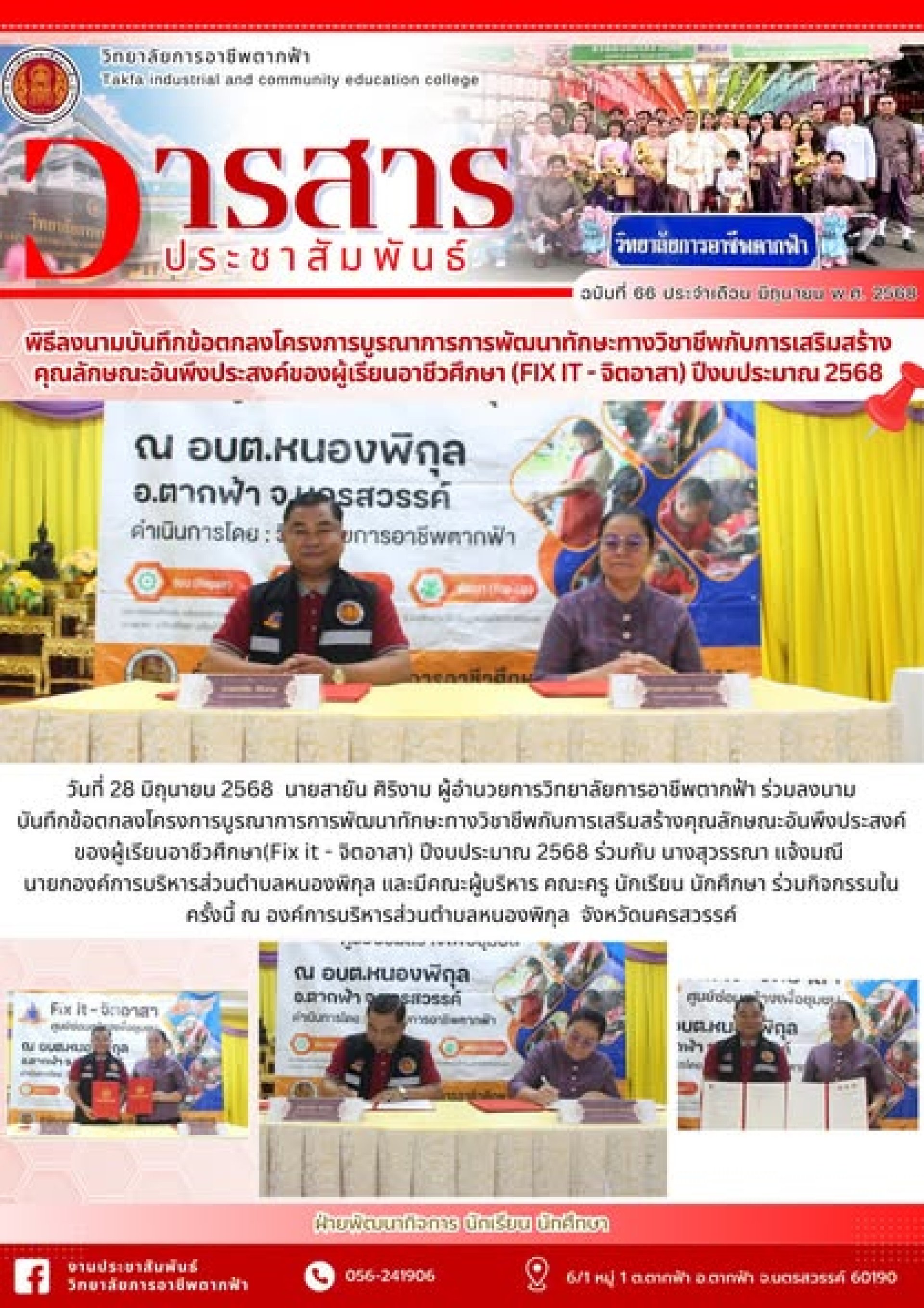 วารสารตากฟ้า ประจำเดือน มิถุนายน 2568 ฉบับที่ 66 พิธีลงนามบันทึกข้อตกลงโครงการบูรณาการการพัฒนาทักษะทางวิชาชีพกับการเสริมสร้างคุณลักษณะอันพึงประสงค์ของผู้เรียนอาชีวศึกษา (Fix it - จิตอาสา) ปีงบประมาณ 2568