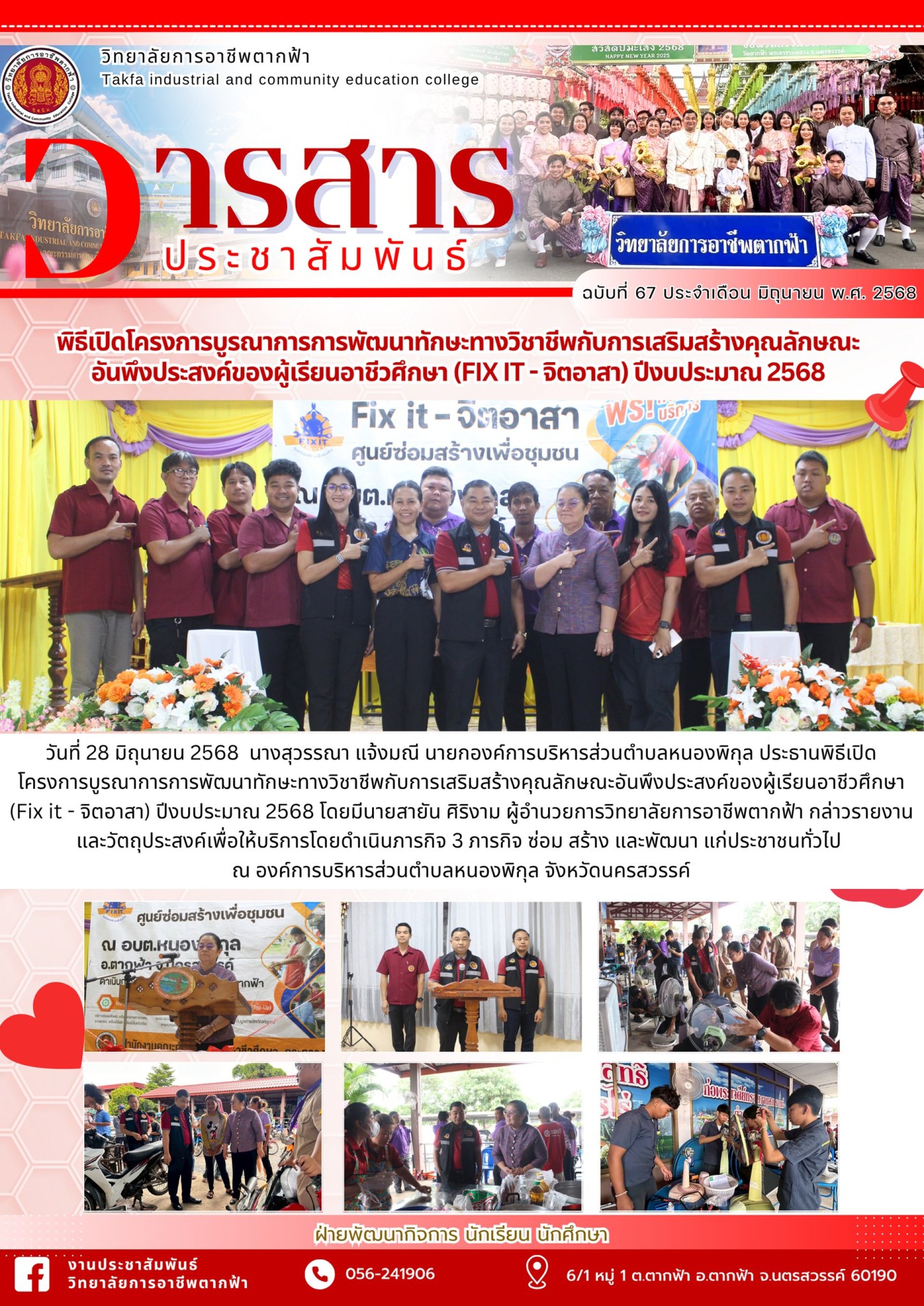 วารสารตากฟ้า ประจำเดือน มิถุนายน 2568 ฉบับที่ 67 พิธีเปิดโครงการบูรณาการการพัฒนาทักษะทางวิชาชีพกับการเสริมสร้างคุณลักษณะอันพึงประสงค์ของผู้เรียนอาชีวศึกษา (Fix it - จิตอาสา) ปีงบประมาณ 2568