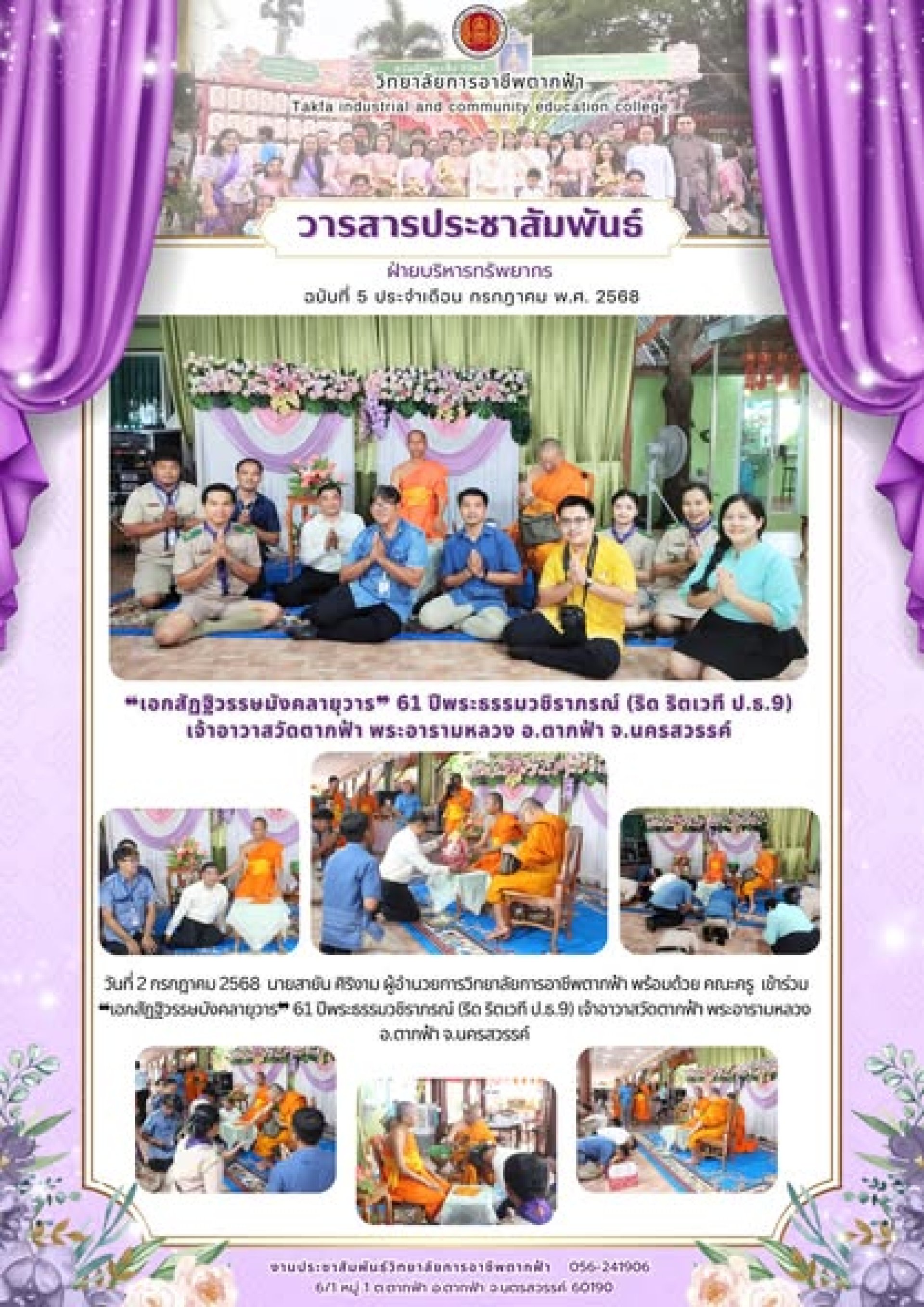วันที่ 2 กรกฎาคม 2568 นายสายัน ศิริงาม ผู้อำนวยการวิทยาลัยการอาชีพตากฟ้า พร้อมด้วย คณะครู เข้าร่วม เอกสัฏฐิวรรษมังคลายุวาร 61 ปีพระธรรมวชิราภรณ์ (ริด ริตเวที ป.ธ.9) เจ้าอาวาสวัดตากฟ้า พระอารามหลวง