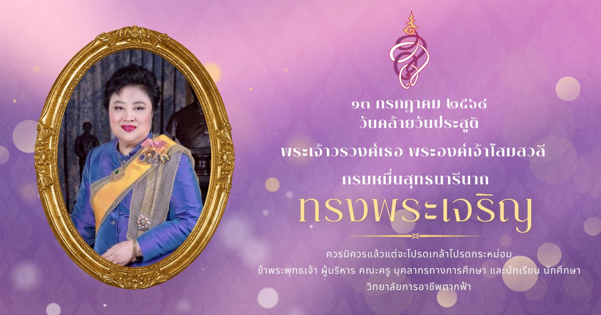 ทรงพระเจริญ ๑๓ กรกฏาคม ๒๕๖๘ “วันคล้ายวันประสูติพระเจ้าวรวงศ์เธอ พระองค์เจ้าโสมสวลี กรมหมื่นสุทธนารีนาถ” ควรมิควรแล้วแต่จะโปรดเกล้าโปรดกระหม่อม ข้าพระพุทธเจ้า คณะผู้บริหาร คณะครู บุคลากรทางการศึกษา และนักเรียน นักศึกษา วิทยาลัยการอาชีพตากฟ้า